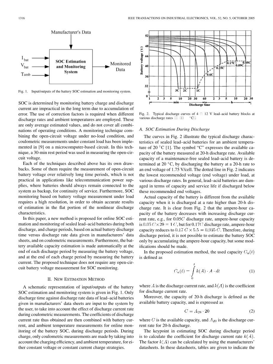 1. 要衡量。已采用一些曲线拟合模型将放电电压与时间特性匹配为指数,抛物线和双曲线曲线[3]–[5]. 除了在窄范围内进行精确电压测量的必要性之外,每个放电条件都需要一个参数组。使用考虑自放电,电池存储容量,内阻和环境温度的数学模型评估铅酸电池容量已在[6]. 放电电压和SOC之间的关系,适用于宽范围的放电速率和温度已被采用[7] 与电信备用电源相关的应用,在额定容量10%放电后,估计精度不低于10%。