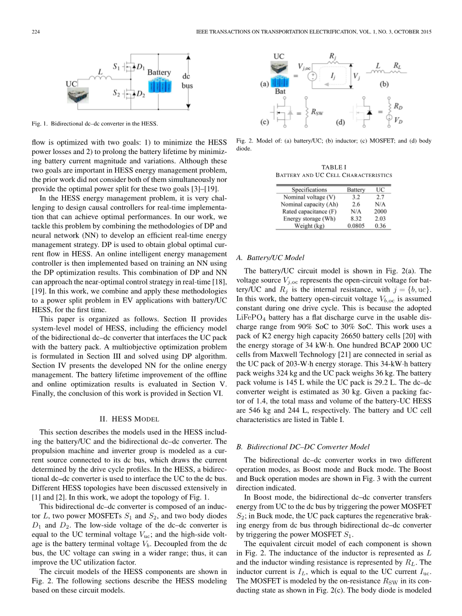 本文组织如下。第二部分给出了HESS的系统级模型,包括连接UC包和电池组的双向dc-dc变换器的效率模型。第三节提出了一个多目标优化问题,并用DP算法求解。第四部分提出了一种用于在线能源管理的神经网络。第五节对离线和在线优化结果的电池寿命改进进行了评估。最后,第六节给出了本工作的结论。