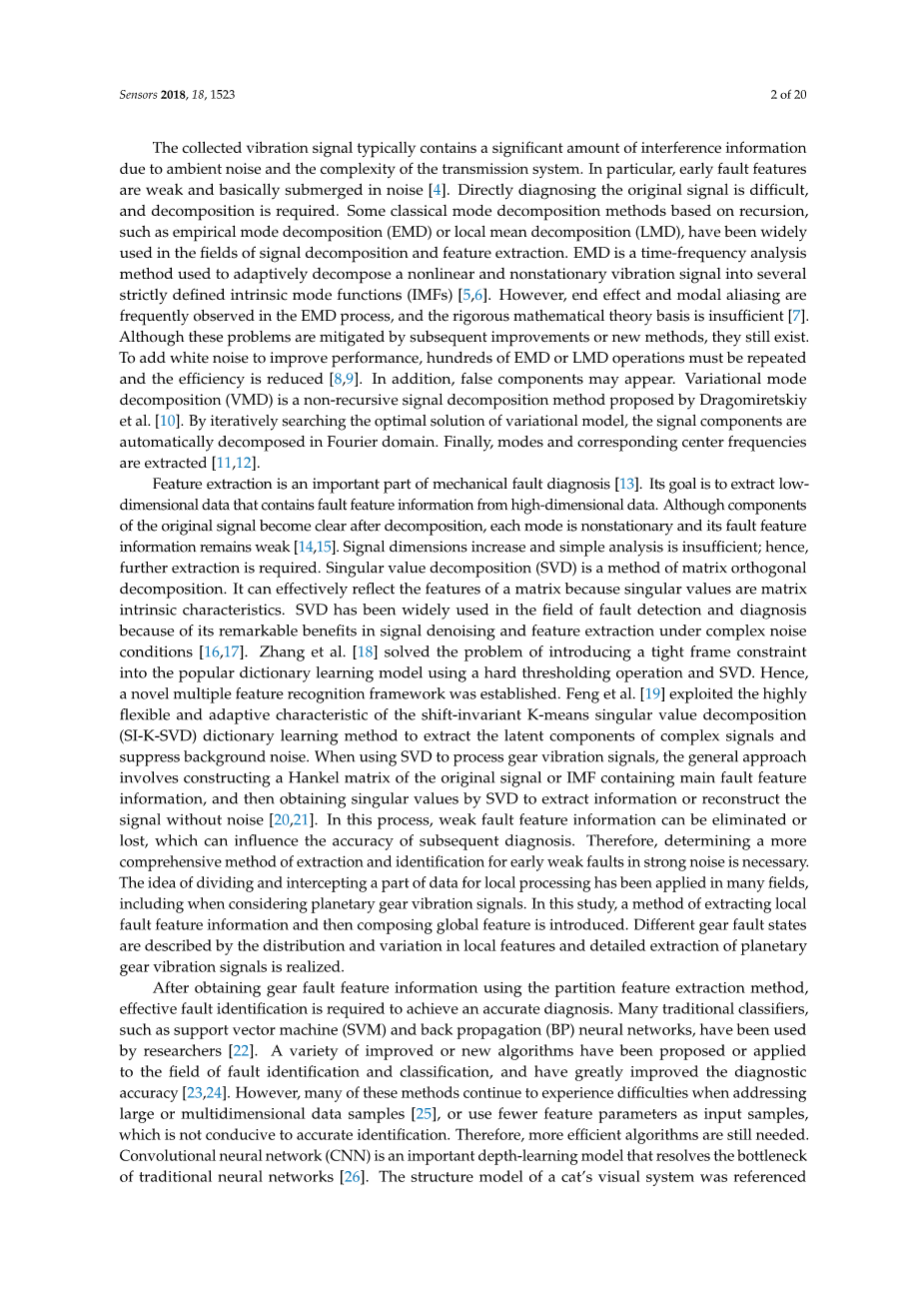 特征提取是机械设备故障诊断的重要组成部分[13]。其目标是从包含故障特征信息的高维度数据中提取低维度数据。原始信号的成分在分解后变得清晰,但每种模式都是非平稳的并且其故障特征信息仍然很弱[14,15]。单纯地增加信号维度和简单分析是不够的;因此,需要进一步提取。奇异值分解(SVD)是一种矩阵正交分解方法。它可以有效地反映矩阵的特征,因为奇异值是矩阵的内在特征。 SVD已广泛应用于故障检测和诊断领域,因为它在复杂噪声条件下的信号去噪和特征提取方面具有显着优势条件[16,17]。Zhang等人[18] 使用硬阈值操作和SVD解决了为popular dictionary learning model引入紧框架约束的问题。因此,建立了一种新颖的多特征识别框架。Feng等人[19]利用具有高度灵活和自适应特性的移位不变K-means奇异值分解(SI-K-SVD)字典学习方法来提取复杂信号的潜在成分和抑制背景噪音。当使用SVD(奇异值分解)处理齿轮振动信号时,一般方法包括构造包含原始信号的Hankel矩阵或主要故障特征的IMF,然后通过SVD获取奇异值以提取特征信息或重构无噪声信号[20,21]。在此过程中,弱故障特征信息可能会被消除或丢失,这可能影响后续诊断的准确性。因此,确定一种可以在强噪声条件下从信号中提取并识别早期故障的综合方法非常必要。划分和截取部分数据以进行本地处理的方法已经应用于许多领域,包括在考虑处理行星齿轮振动信号时。在这项研究中,介绍了一种提取局部故障特征信息然后组成全局特征的方法。通过局部特征的分布和变化以及行星齿轮振动信号的详细提取,实现了对不同的齿轮故障状态的描述。