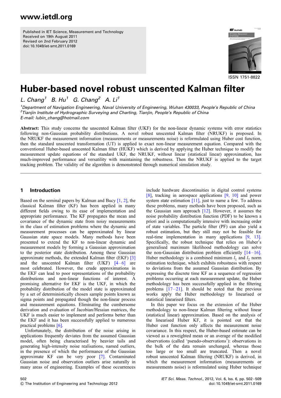 本文着重致力于将Huber方法推广到无线性(统计线性)逼近的非线性卡尔曼滤波。对线性化Huber KF的分析指出了Huber成本函数只影响测量噪声协方差。如此一来,基于Huber的估计可看作为修正观测值的平均值或加权平均数(称为“伪观测”):大部分数据的观测值保持不变,而那些太大或太小的就会被舍弃。在此基础上,提出了一种新的鲁棒无痕卡尔曼滤波法,该方法利用Huber技术对测量信息(测量结果或测量噪声)进行重构并将其用于UKF的标准过程。没有线性(统计线性)近似的话,理论上NRUKF会比线性化或统计线性化的Huber滤波器做得更好,还能保持鲁棒性。