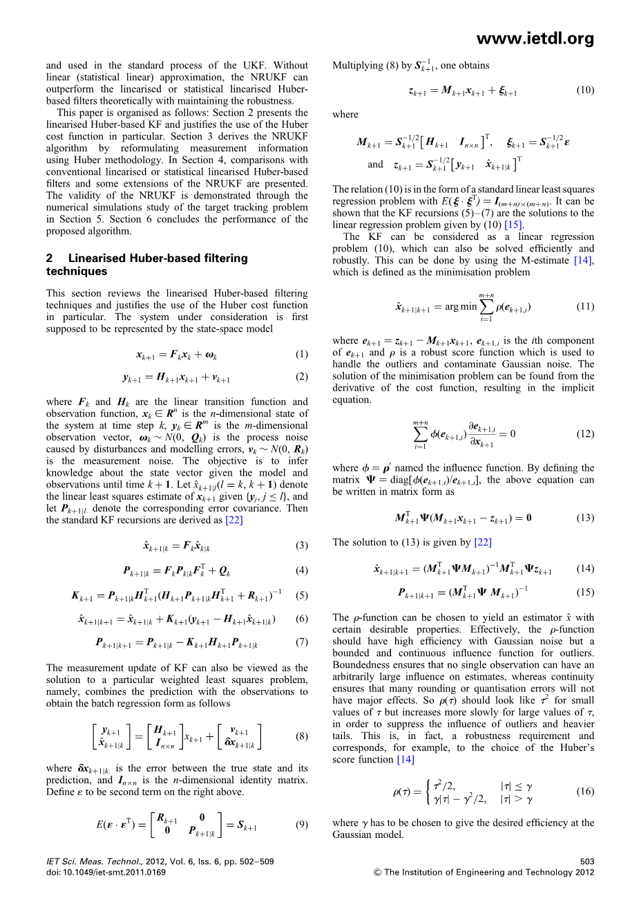 首先,我们将重构(14)和(15)以指出在没有(统计)线性近似的情况下,Huber方法推广到非线性滤波情况的可能性。