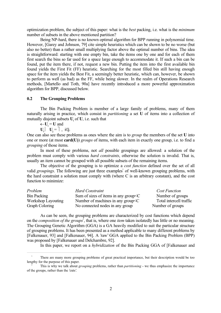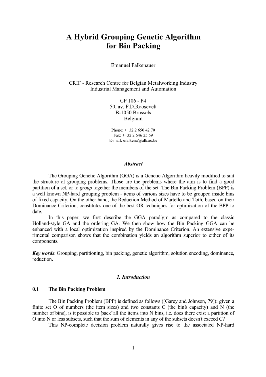 本文的其余部分组织如下。在第2节和第3节中,我们指出了标准气体和顺序气体在用于分组问题时各自的弱点。在第4节中,我们介绍了解决这些缺陷的分组GA (GGA)。第5节给出了Martello和Toth支配标准背后的思想。第6节介绍了由于这两种技术的“联姻”而产生的BPP的混合GGA (HGGA)。第7节对HGGA与复杂的分支绑定算法MTP过程[Martello and Toth, 90b]进行了广泛的实验比较。结论见第8节。