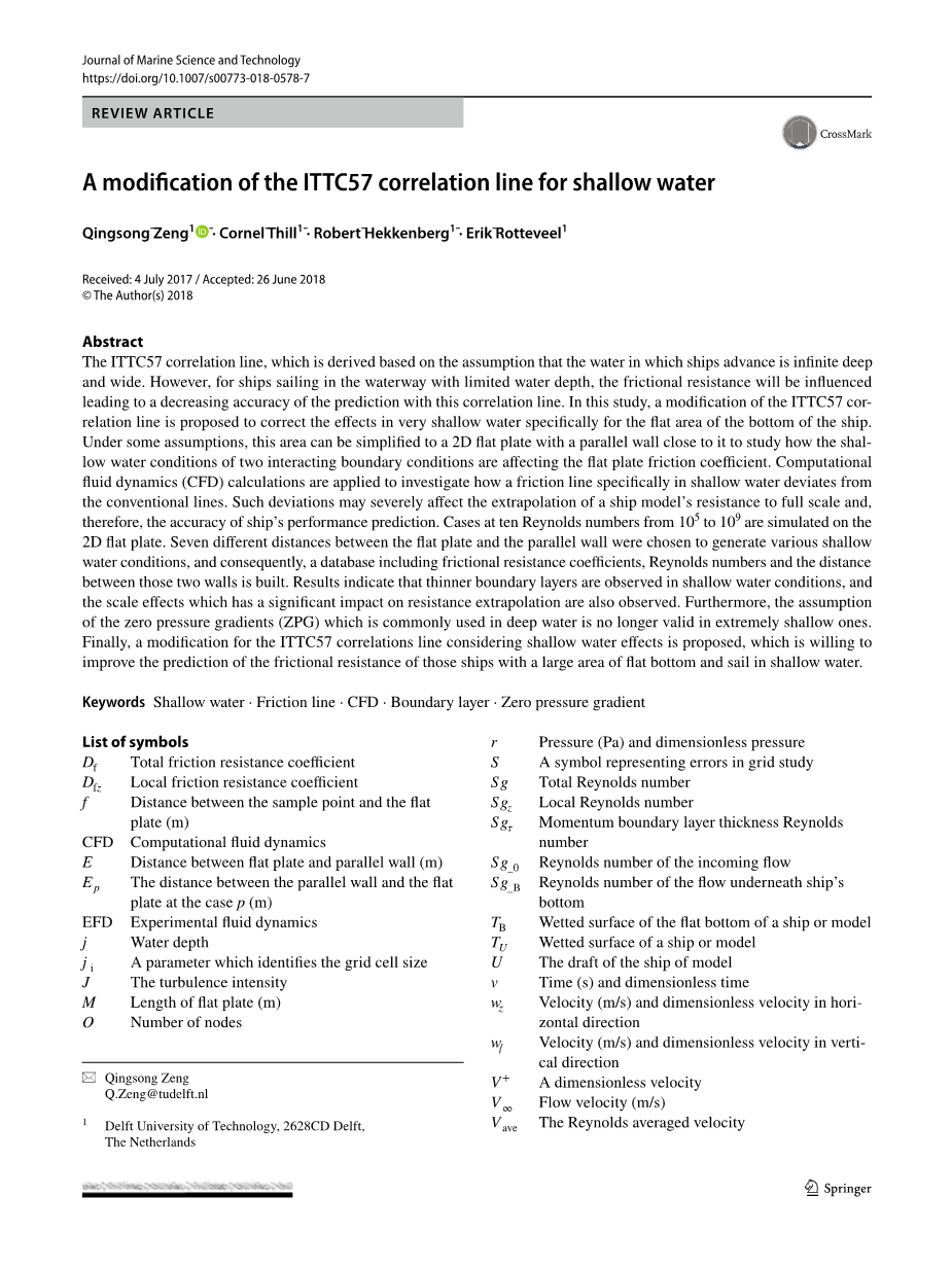 对摩擦特性/相关线在各种条件下的更好理解有助于更好的模型船外推,这反过来有助于船舶设计和优化。这种预测是基于对边界层理论和平板摩擦线的理解。在过去的一个世纪里,研究人员提供了几种摩擦线,如Schoenherr [1]、Grigson [2]和Katsui [3]提出的平板摩擦线,和1957年ITTC[4]的相关线经常用于预测船舶的摩擦阻力。这些方法是在无限制流入的情况下基于实验和/或数值模拟的结果。在这些情况下,沿平板的压力梯度假定为零。然而,实际上,进入的流量通常受到限制。内河船舶在河流和运河中航行时,船舶阻力受航道限制的影响。1987年ITTC[5]指出,当水深与船舶吃水之比小于4.0时,浅水效应会很明显。不同的研究人员[6-8]提供了预测浅水阻力的方法,但没有具体和完全地讨论摩擦的变化,而摩擦是大多数内陆船只阻力的主要部分。由于横向影响(即水道两侧的影响)比垂直方向(即水道底部)小得多[9],因此本研究仅关注纯水中平板摩擦的影响。此外,船舶和航道底部之间缝隙的流入条件受到形式和流型效应的影响(对更多非常浅水域中的二维模型),这些效应正在进一步研究。