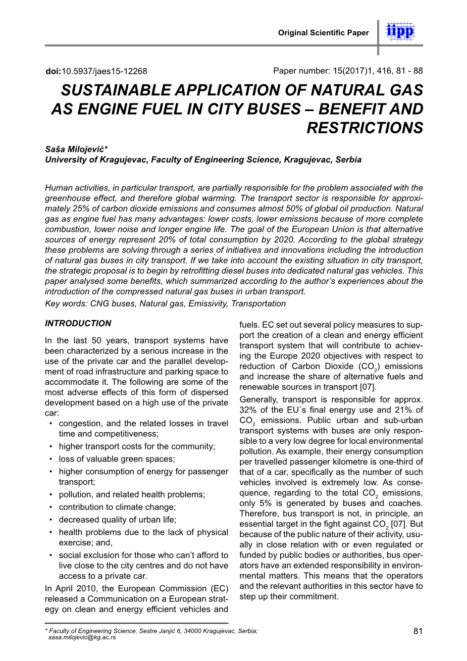 在克拉古耶瓦茨市中的城市公交系统中有50辆巴士, 每天平均行驶约250公里 (每年315个工作日)。通过应用 CNG 公交车代替现有的柴油发动机, 噪音和排放将实现一个相当大的削减。