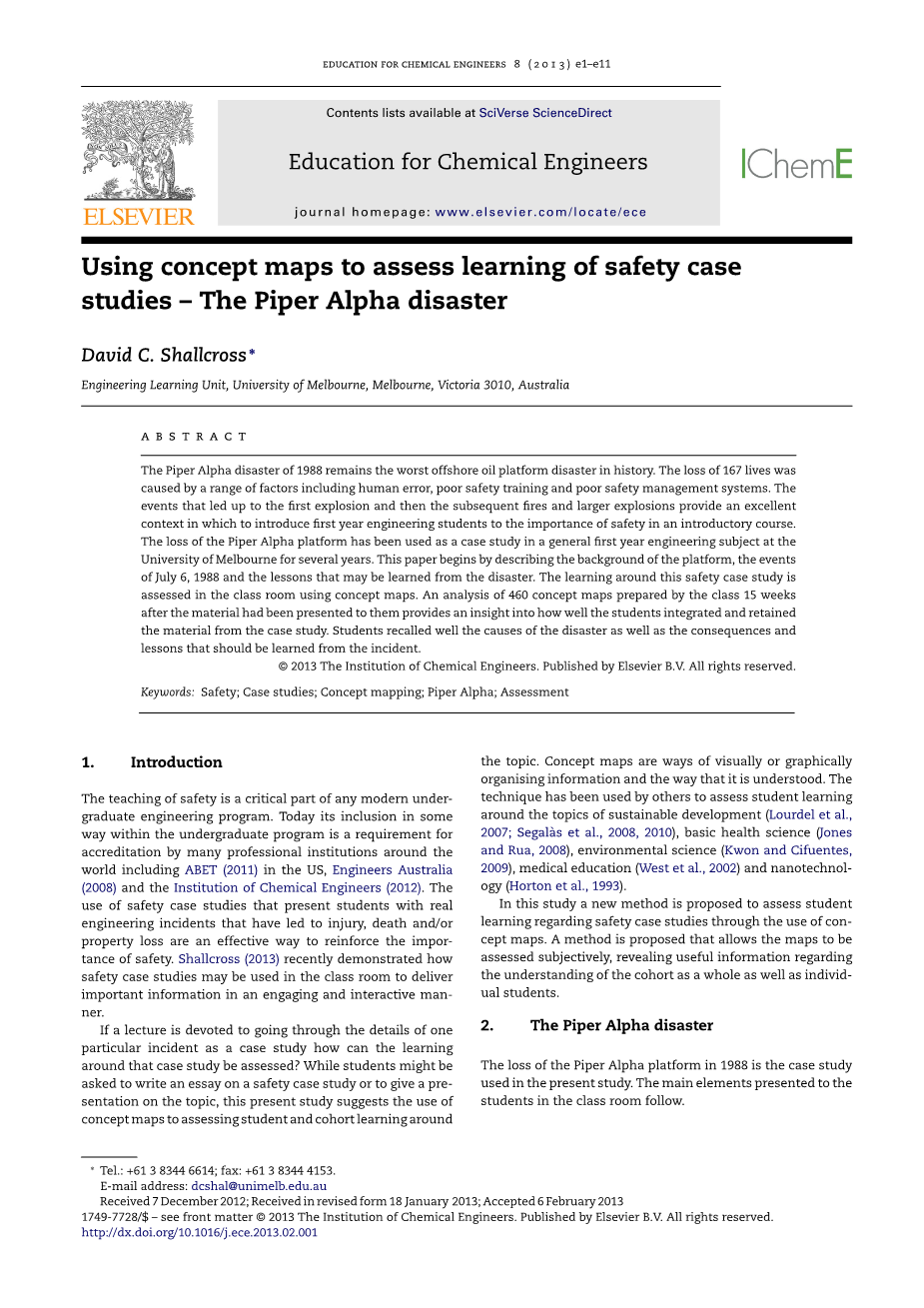 1988年的Piper Alpha灾难仍然是历史上最严重的海上石油平台灾难。 167人丧生是由一系列因素造成的,包括人为错误,安全培训不良和安全管理系统不足等。这导致了第一次爆炸,并且导致随后的火灾和更大爆炸的事件,它们提供了一个很好的机会,可以让第一年的工科学生在入门课程中了解安全的重要性。 Piper Alpha平台的事故,已被用作墨尔本大学多年的普通第一年工程学科的案例研究。本文首先介绍平台的背景,1988年7月6日的事件以及可能从灾难中吸取的教训。围绕这个安全案例研究的学习方法,是在课堂上使用概念图进行评估。把材料提交给他们,让他们在后15周的课程准备对460个概念图进行分析,可以深入了解学生如何整合和保留案例研究中的材料。学生们可以很好地回忆灾难的原因以及应该从事件中吸取的后果和教训。