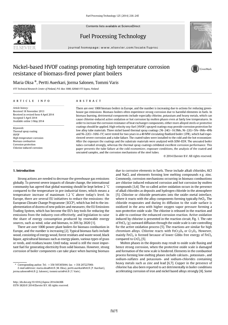 欧洲有超过1000个生物质锅炉,由于减少温室气体排放的行动,这个数字正在增加。由于燃料中的有害元素,生物质锅炉经常遭受强烈腐蚀。在生物质燃烧中,有害成分尤其包括氯,钾和重金属,即使在相当低的温度下也会引起氯诱导的活性氧化或熔融相的热腐蚀。为了提高热交换器部件的耐腐蚀性,应该使用更多的合金钢或保护涂层。高速氧-燃料(HVOF)喷涂涂层可为低合金管材料提供腐蚀保护。三种镍基热喷涂涂层(Ni-24Cr-16.5Mo,Ni-22Crb5FE-9Mo-4NB