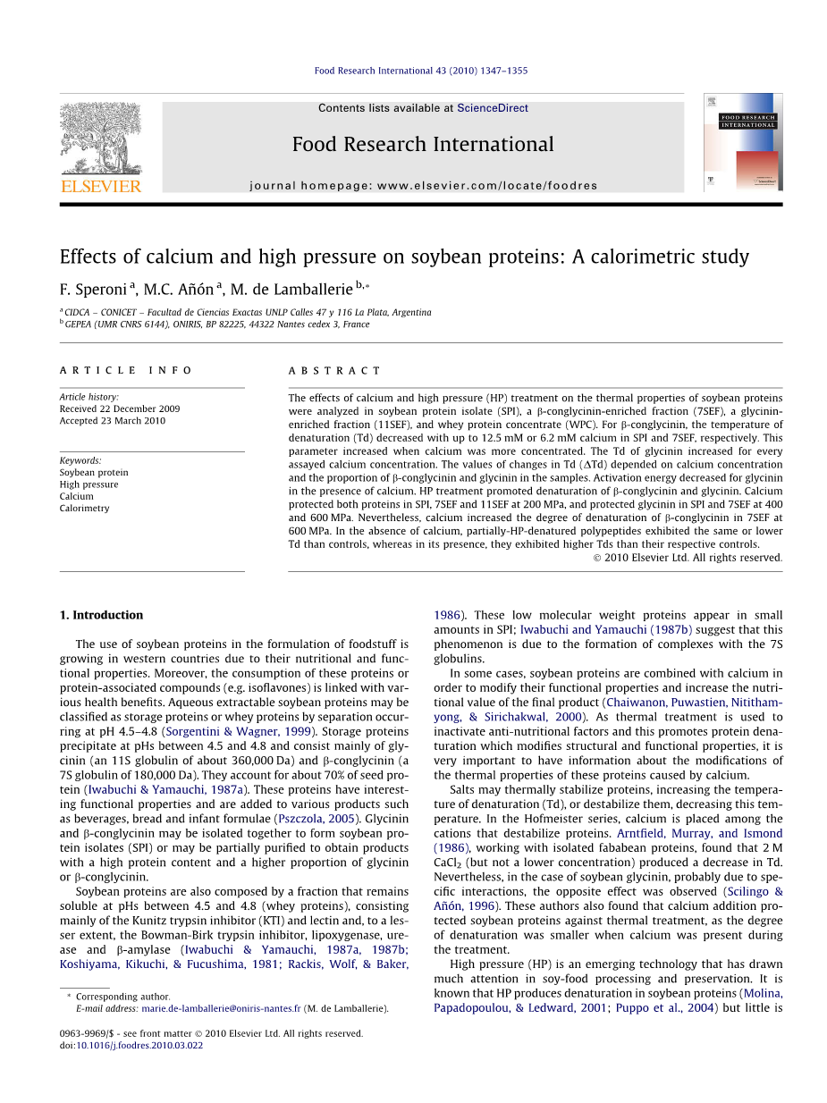 钙和高压对大豆蛋白的影响:量热研究