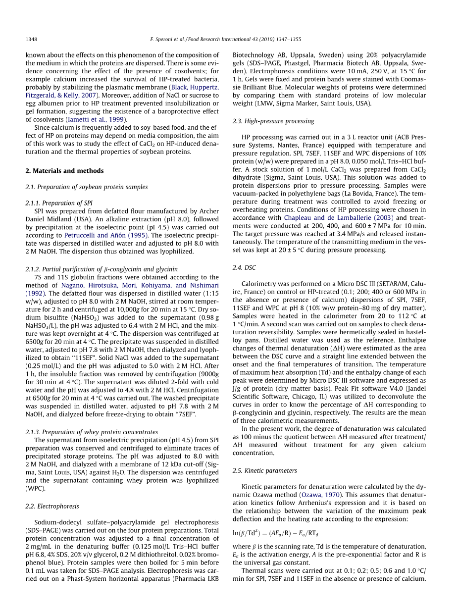 在大豆蛋白分离物(SPI),富含b-伴大豆球蛋白的部分(7SEF),富含大豆球蛋白的部分(11SEF)和乳清中分析了钙和高压(HP)处理对大豆蛋白热特性的影响浓缩蛋白(WPC)。 对于b-伴大豆球蛋白,SPI和7SEF中的变性温度(Td)分别降低至12.5mM或6.2mM。 当钙浓度更高时,这个参数增加。 对于每个测定的钙浓度,大豆球蛋白的Td都增加。 Td(DTd)的变化值取决于钙浓度和样品中b-伴大豆球蛋白和大豆球蛋白的比例。 在存在钙的情况下,大豆球蛋白的活化能下降。 HP处理促进了b-伴大豆球蛋白和大豆球蛋白的变性。 钙在200MPa下保护SPI,7SEF和11SEF中的两种蛋白质,并且在400和600MPa下保护SPI和7SEF中的大豆球蛋白。 然而,钙在600MPa下增加了7SEF中b-伴大豆球蛋白的变性程度。 在不存在钙的情况下,部分-HP-变性的多肽显示与对照相同或更低的Td,而在其存在下,它们表现出比其各自对照更高的Td。