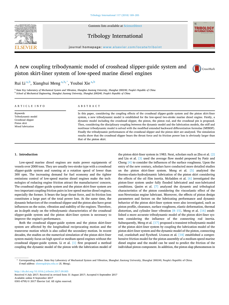 低速船用柴油机是2000吨以上船舶的主要动力设备。它们通常是二冲程类型,带有十字头滑块导轨系统,并且运行速度低于300 rpm。日益增长的燃油经济性需求和低速船用柴油发动机排放控制的严格化使得降低发动机摩擦的技术吸引了制造商的关注。十字头滑靴系统和活塞裙衬系统是低速船用柴油机的两个重要的耦合摩擦副,尤其是十字头滑靴系统。它承受着较大的推力,其摩擦损失占总功率损失的很大一部分。同时,十字头滑块和活塞的动态特性也对发动机的噪声,振动和稳定性有很大的影响。因此,深入研究十字头滑块导轨系统和活塞裙衬系统的三体特性是提高发动机性能的必要条件。