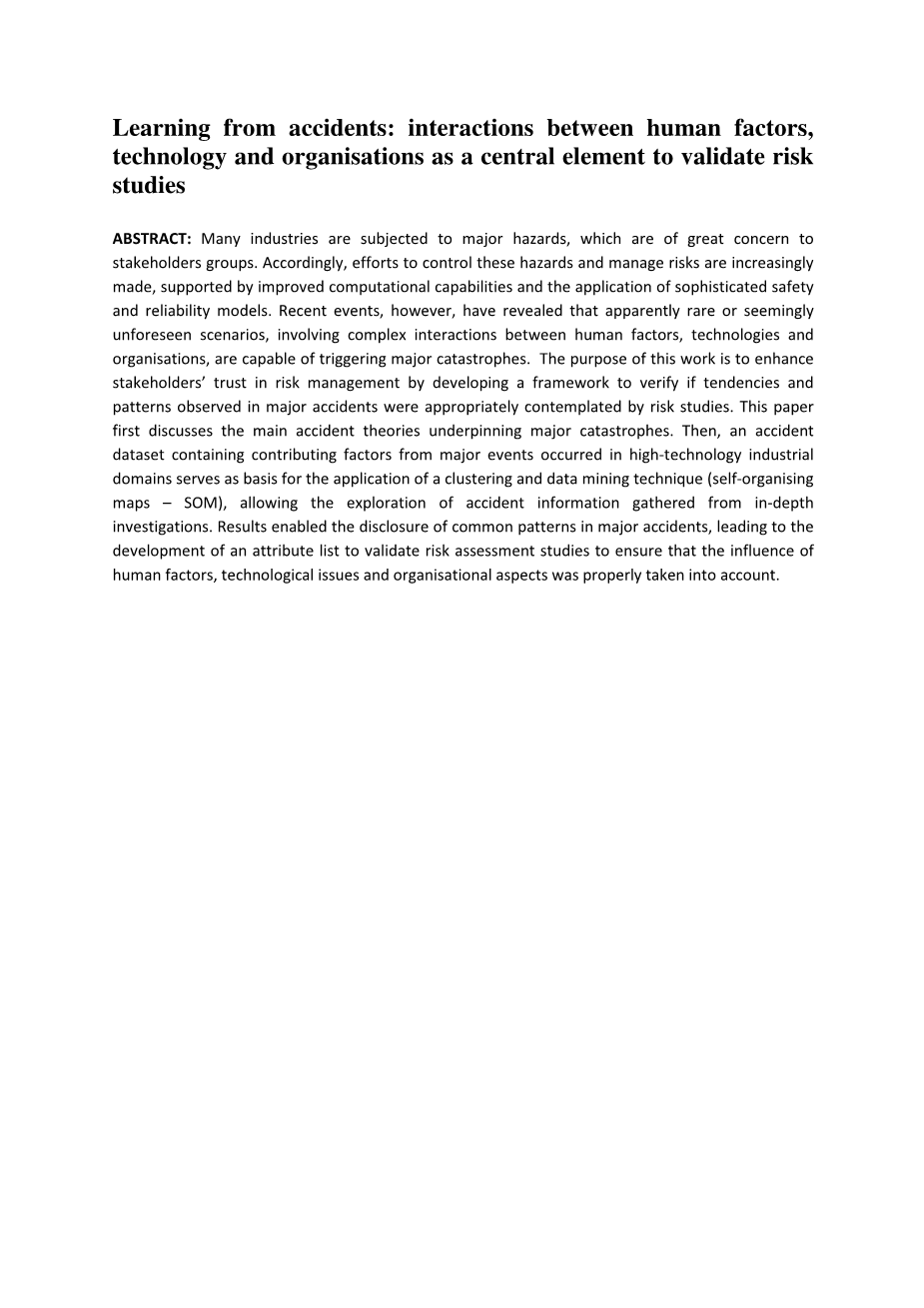 摘要:许多行业受到重大危害,与其利益相关的群体对此非常关注。因此,在得到改进的计算能力和复杂的安全应用程序以及可靠性模型的支持,越来越多地努力控制这些危害和管理风险。然而,从最近发生的事故来看,这显然是罕见的或看似意外的情况。 人为因素、技术和组织之间复杂的相互作用,能够引发重大灾难。这项工作的目的是加强利益相关的人对风险管理的信任。 通过制定一个框架,以核实风险研究是否适当地考虑了在重大事故中观察到的趋势和模式。本文首先讨论了重大灾难的主要基础理论。然后,一个包含高科技工业领域发生的重大事故的成因的事故数据集作为一种聚类和数据挖掘技术(自组织地图-SOM)的应用基础,允许探索从深入调查中收集到的事故信息。结果关于重大事故的常见模式得到公开,导致制定一份属性列表,以验证风险评估研究,确保人为因素、技术问题和组织方面的影响都得到了适当的考虑。