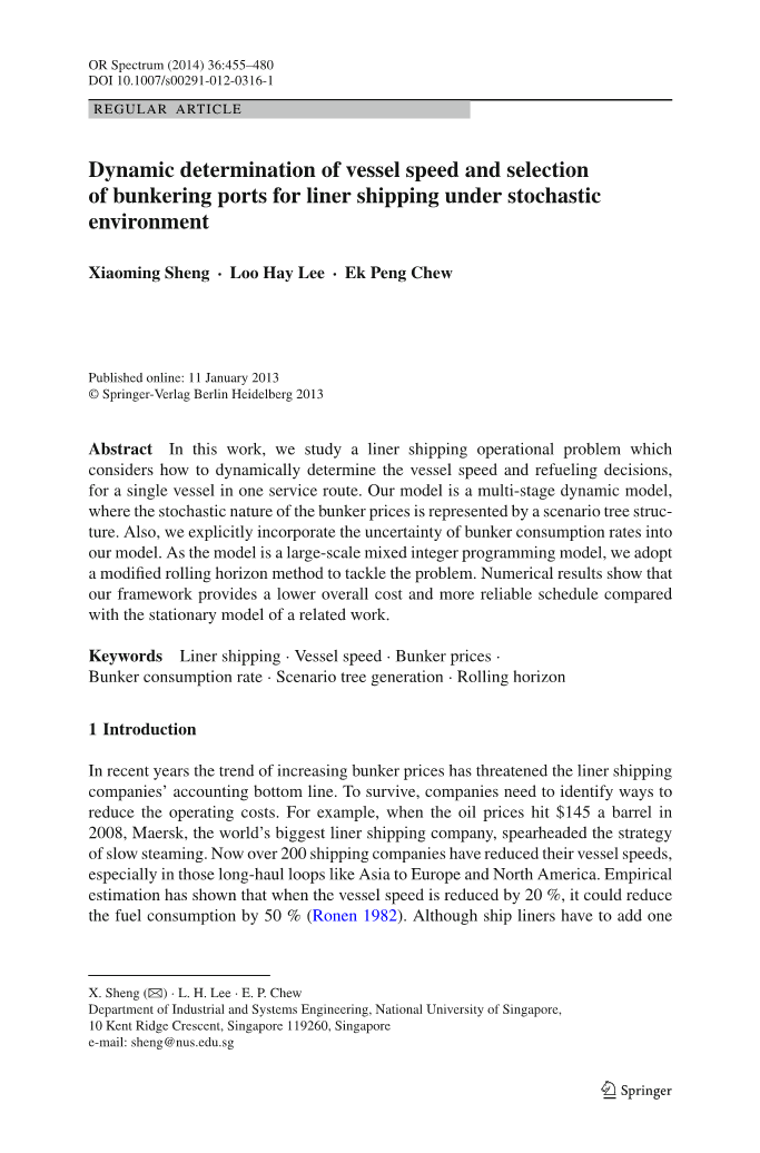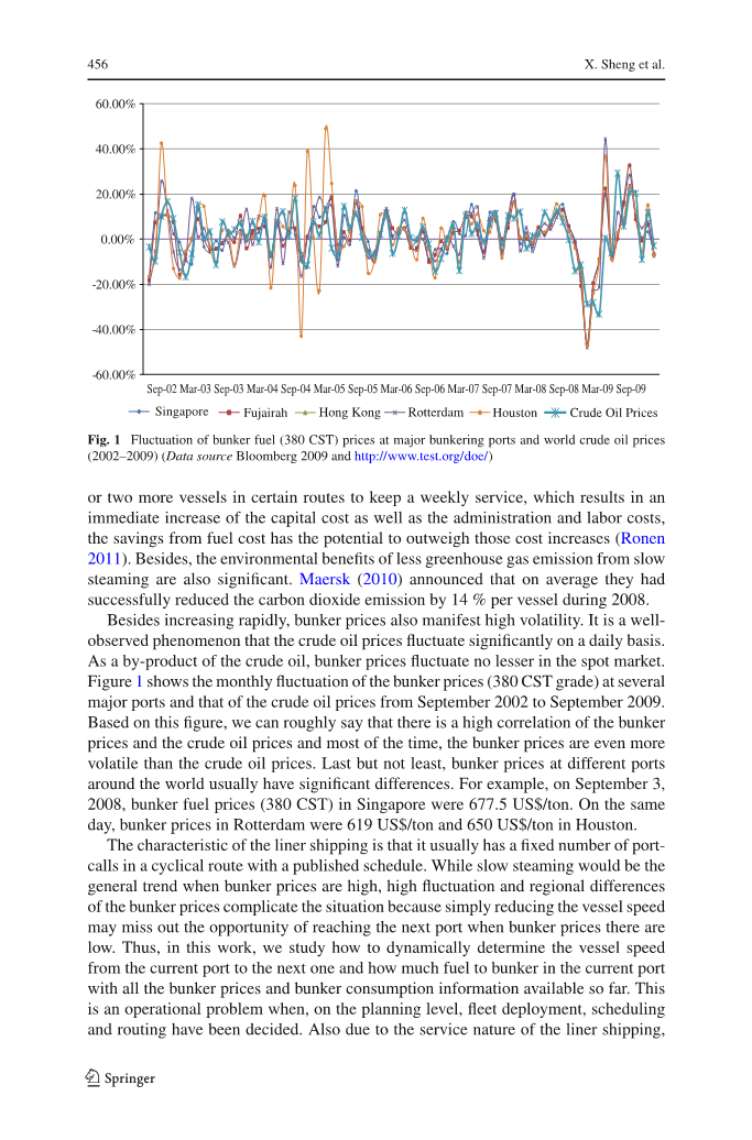 Yao研究了一个与我们的性质类似的问题,但在他们的研究中,重点放在了计划水平问题上,因此没有解决不确定性问题。关于燃料消耗率与船速之间的关系,他们分析了不同尺寸船舶的分析结果。另外,不是假设一个单一的三次关系,而是在回归模型中增加了一个常数系数,通过数值实验证明它们不是微不足道的。在所有上述研究中,燃料价格要么假定为恒定或者没有明确考虑。