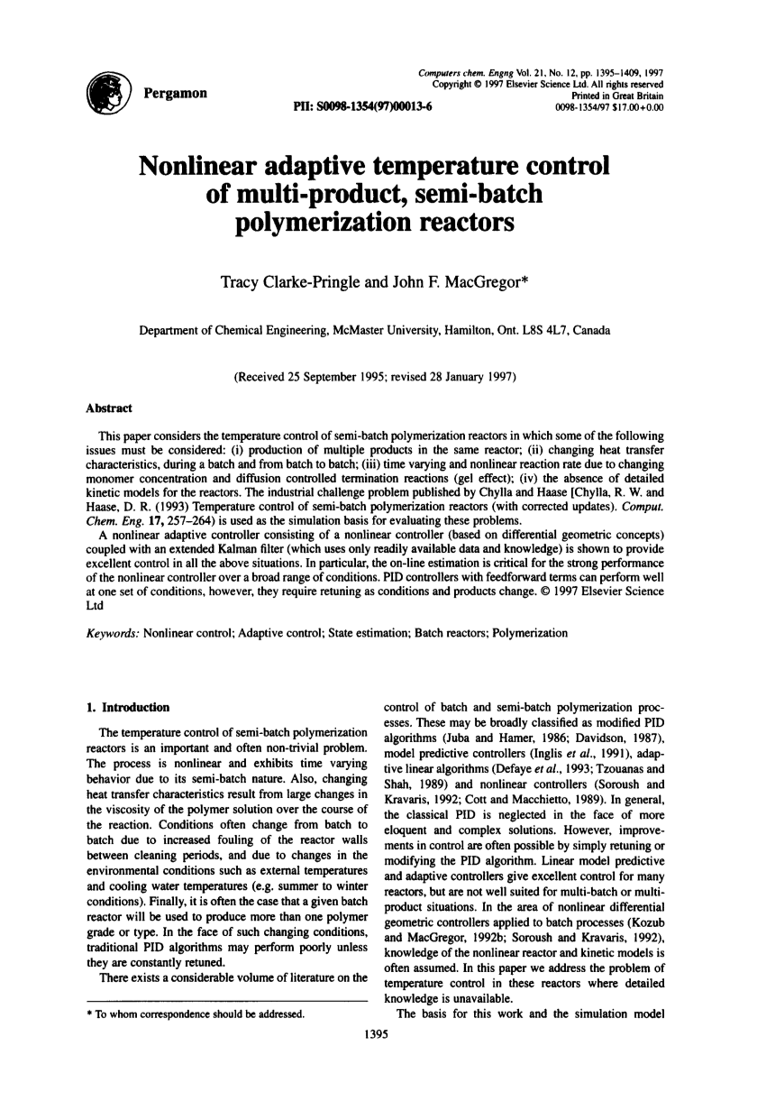 摘要:本文认为半间歇聚合反应器的温度控制存在以下一些必须考虑的问题:(一)如何在同一反应器中生产多种产品; (二)如何在一个批次中和批次与批次之间改变传热的特性; (三)反应速率是随时间非线性变化的会导致单体浓度和扩散控制终止反应(凝胶效应); (四)反应堆的动力学模型的建构缺少详细的资料。通过Chylla和哈斯发表的研究论文解决了这个产业挑战难题。半间歇式聚合反应器的温度控制(校正更新)化学工程. 17,257-264)]被用作评估这些问题的理论基础。由非线性控制器的非线性自适应控制器(基于微分几何概念)再加上一个扩展卡尔曼滤波器(仅使用容易获得的数据和知识)能对上述的所有情况进行完美的控制。特别地,在线估算对使非线性控制器在各种各样的条件下有很好的控制表现非常重要。在一个设定的条件下,具有前馈项的PID控制器的表现要优于其他的没有该项的控制器。但是,一旦具体条件和产品发生变化,他们的参数就需要重新调整。
