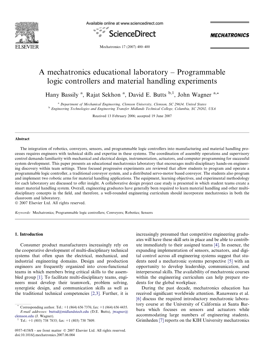 在制造和物料搬运过程中,机器、传输带、传感器以及可编程控制器的集成需要工程师拥有关于这些系统的技术技能以及专业知识。为了系统的成功开发,协调好装配流程以及管理控制需要熟悉机械和电气设计、仪表、执行器、计算机编程等相关知识。本文提出的教育机电一体化实验室,鼓励多学科、实践性以及具有团队性的工程项目系统集成。并重点叙述了三个渐进的实验,允许学生对可编程逻辑控制器进行编程,并操作传统的输送机系统,分布式伺服马达为基础的输送机。学生们还计划和实现两个机械手材料处理应用程序。设备,学习目标,每个实验的实验方法引导学生更好的思考以及洞察问题。一个协同设计方案的研究出现在能够创造智能物料搬运系统的学生团队中。总的来说,工程毕业生一般都要求学习物料搬运和其他多学科领域的概念,因此,全面的工程学课程应该包含机电一体化理论和实验室教学。