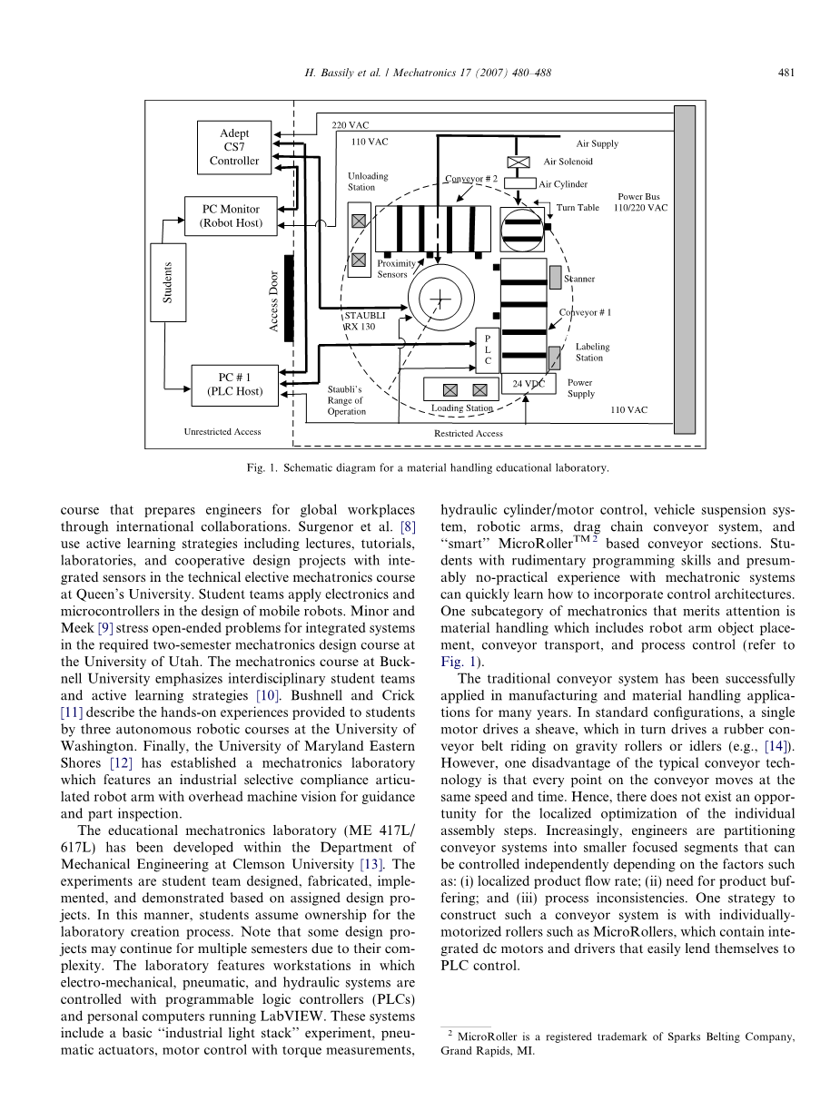 在克莱姆森大学机械工程系教育性机电一体化实验已经开展[13]。这些实验是学生团队基于指定的设计项目设计、装配、实现和演示的。通过这种方式,学生们能够自主完成实验的创建过程。注意, 一些设计项目因为复杂可能持续多个学期。实验室功能工作站的机电、气动和液压系统由可编程逻辑控制器(plc)和个人电脑运行的虚拟软件(LabVIEW)控制。这些系统包括一个基本的“工业光堆栈”实验,气动执行机构、电机控制与转矩测量,液压缸/马达控制、车辆悬架系统、机器人手臂,牵链输送机系统,和“智能”微型滚筒TM2建立输送机部分。拥有基本的编程技能,只是没有机电一体化系统的设计经验的学生能很快的学会怎样组成控制体系。值得关注的机电一体化的一个子类是物料搬运系统,包括机器臂对象位置、输送机运输和过程控制(参见图1)。