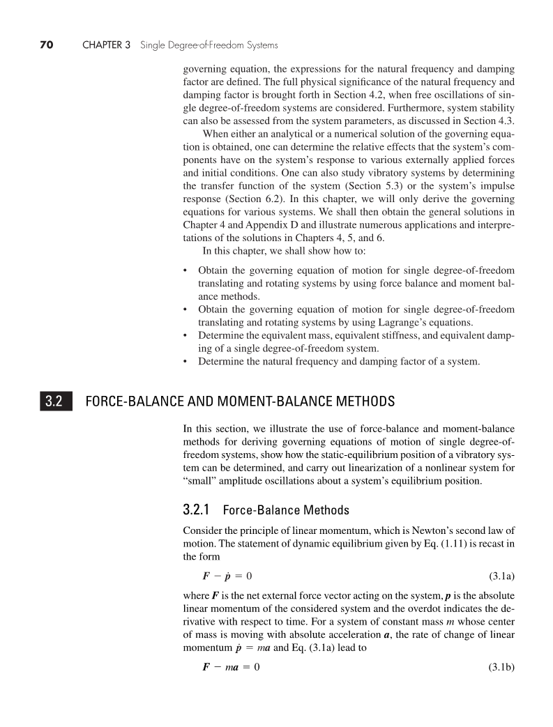 在这一节中,我们说明了利用力平衡和力矩平衡方法来推导单自由度系统的运动方程,说明如何确定振动系统的静态平衡位置,并对一个系统平衡位置的“小”振幅振荡进行非线性系统的线性化。
