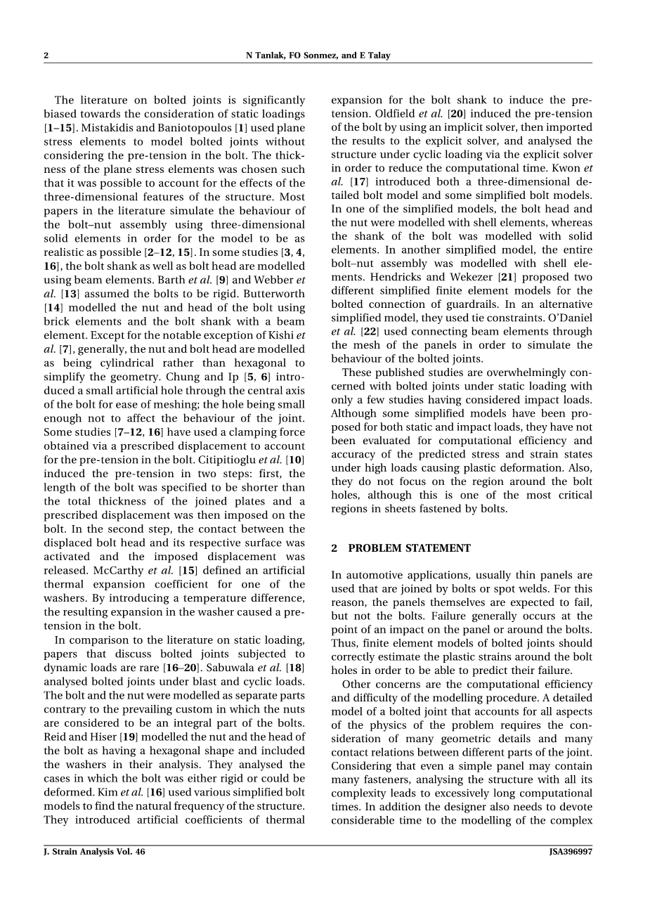 关于螺栓连接的文献显着偏向于考虑静载荷[1-15]。 Mistakidis和Baniotopoulos [1]使用平面应力元素来模拟螺栓连接而不考虑螺栓中的预应力。平面应力元件的厚度被选择为使得有可能考虑结构的三维特征的影响。文献中的大多数论文使用三维实体单元模拟螺栓螺母组件的行为,以使模型尽可能现实[2-12,15]。在一些研究[3,4,16]中,螺栓杆和螺栓头采用梁单元进行建模。 Barth等人[9]和韦伯等。 [13]假定螺栓是刚性的。 Butterworth [14]使用砖单元和带梁单元的螺栓杆来模拟螺栓的螺母和头部。除了Kishi等人的着名例外。 [7]通常,螺母和螺栓头被模拟为圆柱形而不是六角形以简化几何形状。 Chung和Ip [5,6]通过螺栓的中心轴线引入了一个小的人造孔,以便于啮合;孔足够小而不会影响接头的性能。一些研究[7-12,16]已经使用通过规定位移获得的夹紧力来解释螺栓中的预应力。 Citipitioglu等人[10]分两步引起预张力:首先,螺栓的长度被规定为小于连接板的总厚度,然后对螺栓施加规定的位移,其次,移动的螺栓头与其相应表面之间的接触被激活并且所施加的位移被释放。 McCarthy等人[15]为其中一个垫圈定义了人造热膨胀系数。通过引入温差,垫圈中产生的膨胀导致螺栓中的预应力。