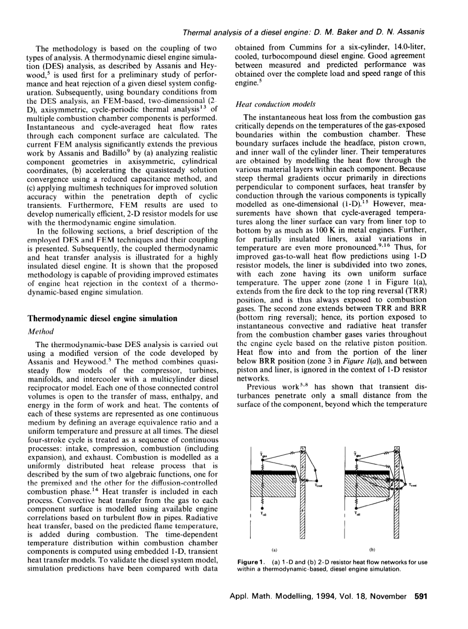 该方法基于两种类型分析的耦合。如Assanis和Hey wood5所描述的热力学柴油发动机模拟(DES)分析首先用于对给定柴油系统配置的性能和排热的初步研究。 随后,使用来自DES分析的边界条件,执行多个燃烧室部件的基于FEM的二维(2-D)轴对称循环周期性热分析13。 计算通过每个部件表面的瞬时和周期平均热流量。 (a)分析轴对称圆柱坐标系下的实际零件几何形状,(b)使用减小电容法加速准静态解收敛,以及