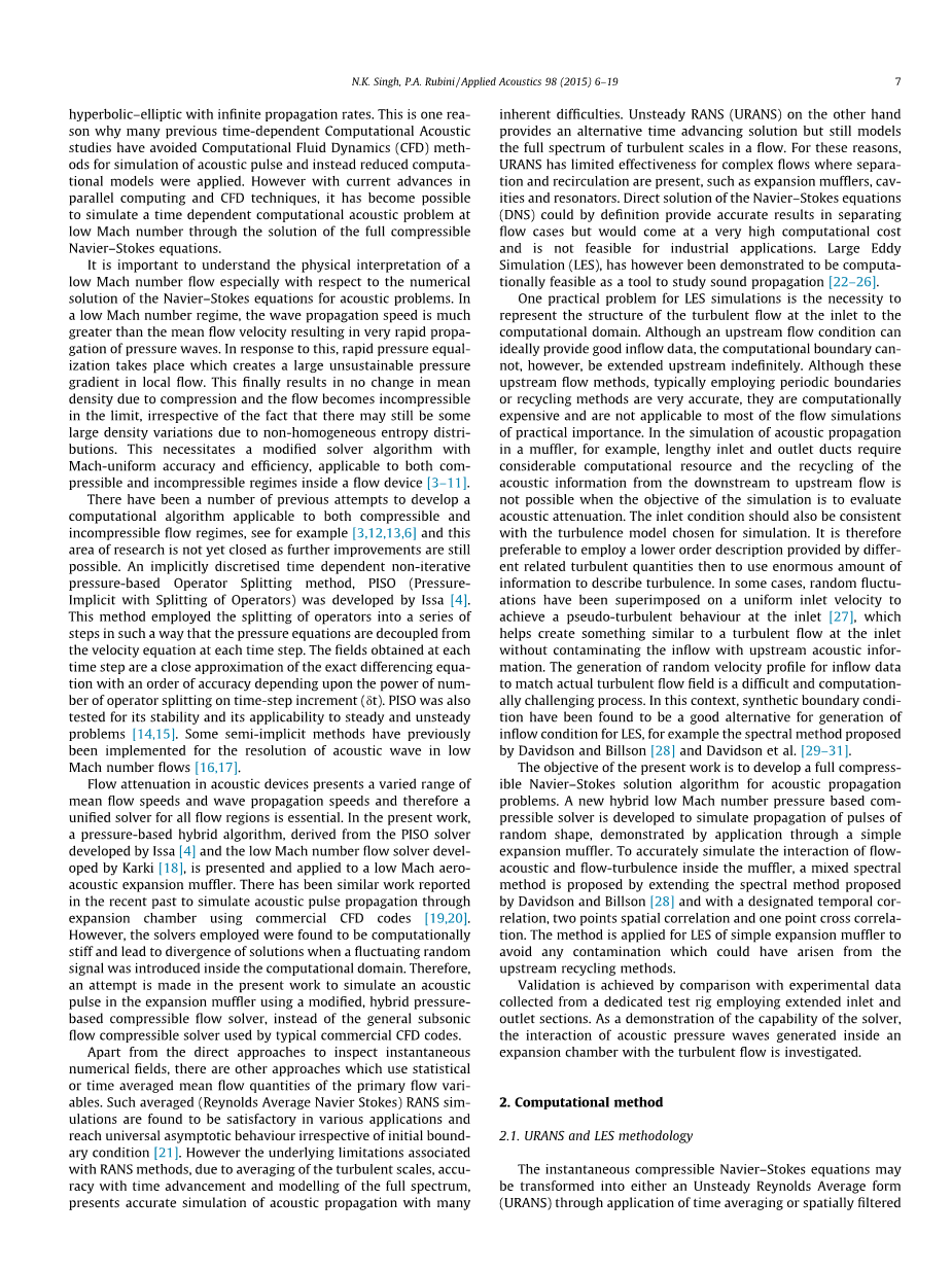 尽管对膨胀室消声器的实验和研究分析做了大量的工作,但由于数值求解方法的大量计算要求的缺点,对消声器的高保真大涡模拟(LES)甚至于直接数值模拟(DNS)的领域则相对没有什么进展。然而,由于计算机内存和运行速度的不断提高,计算机模拟在这些问题上的应用,至少在LES的形式下是可行的。对这一模拟过程的应用和理解将有助于解释声信号与紊流的相互作用,这是大多数工业应用的主导机制。尽管在计算机模拟领域有相当大的发展,但许多问题阻碍了基于Navier-Stokes方程数值解的计算声学的发展。这些问题包括了描述底层湍流流场和与声波传播有关的流场在时间和空间尺度上的视差。不可压缩的解算器(与可压缩的解算器相比)减少了计算工作量,但减少工作量的代价是损失了来自以上问题的声学信息。这样的声学信息往往是问题的关键,特别是在理解声学脉冲在各种声学设备中的物理传播的方面上。对于可压缩的解算器,气动声学的噪声模拟或湍流模拟需要高度分辨的空间和时间分辨率的声学信息。此外,控制方程改变了它们的数字形式,非定常无粘性可压缩流动的方程表示具有有限波速的双曲线系统,而它们的不可压缩对应体是具有无限传播速率的双曲线椭圆。这就是为什么许多以前依赖于时间的计算声学研究都避免了计算流体动力学(CFD)方法来模拟声学脉冲,并且减少了计算模型。然而,随着并行计算和CFD技术的发展,可以通过完全可压缩的Navier-Stokes方程的解在低马赫数下来模拟一个时间依相关的计算声学问题。
