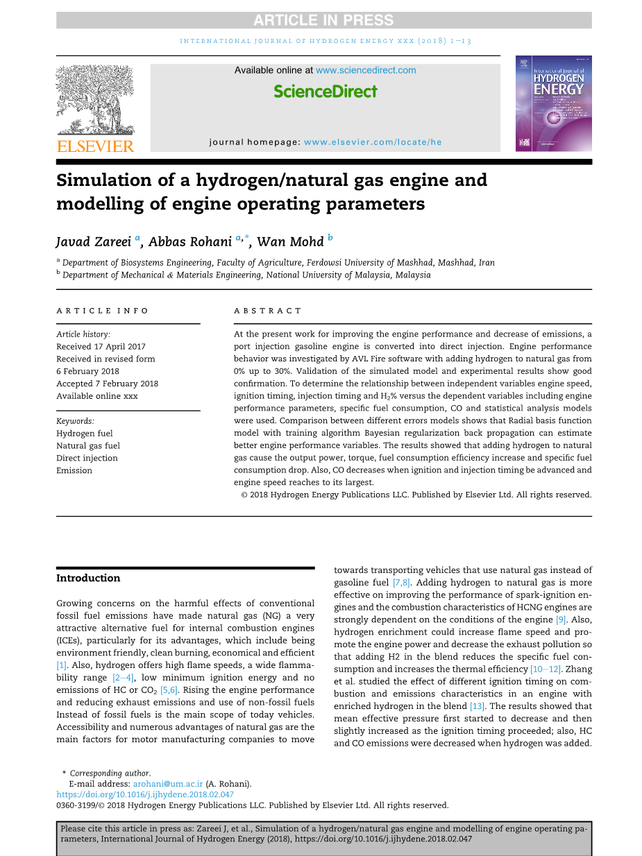 在目前,为提高发动机性能和减少排放量的工作中,进气道喷射汽油发动机被转化为直接喷射。AVL Fire软件通过将天然气中的氢气的添加量从0%增加到30%来研究发动机性能。为了确定独立变量发动机转速,点火正时,喷射正时和氢气体积分数与因变量(包括发动机性能参数,比耗油量,CO和统计分析模型)之间的关系,验证模拟模型的实验结果显示了很好的效果。不同误差模型之间的比较表明,具有训练算法贝叶斯正则化反向传播的径向基函数模型可更好的估计发动机性能变量。结果表明,在天然气中添加氢气会导致输出功率,扭矩,燃油消耗效率提高,燃油消耗率下降。另外,当点火和喷射正时提前并且发动机转速达到最大时,CO排放减少。