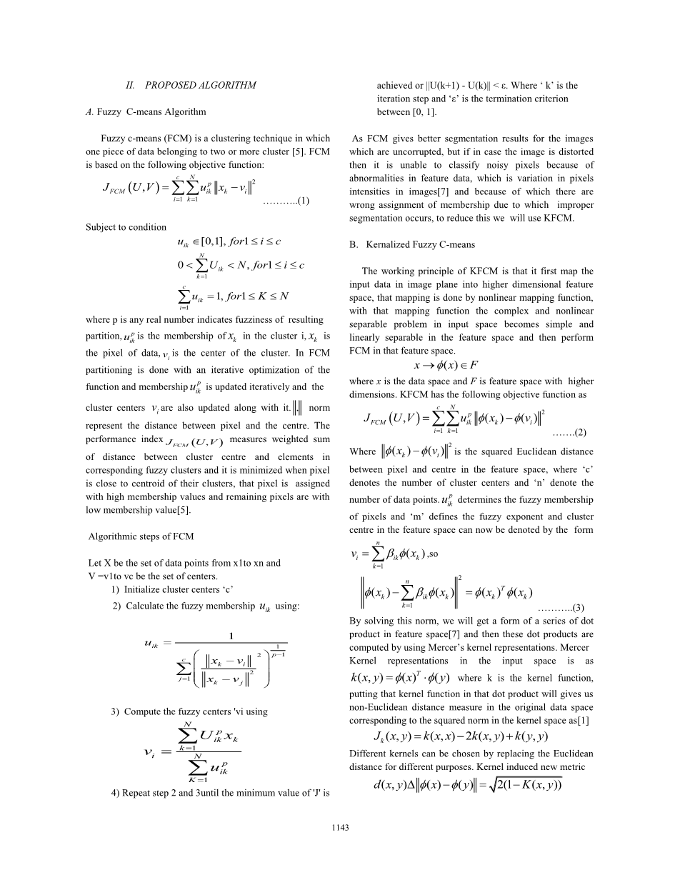 由于FCM对未损坏的图像提供了更好的分割结果,但是,如果图像失真,则由于特征数据的异常而无法对噪声像素进行分类,有错误的成员分配,由于不正确的分割发生,导致了图像[7]中像素强度的变化,也是由于这些原因,为了减少这一点,我们将使用KFCM。