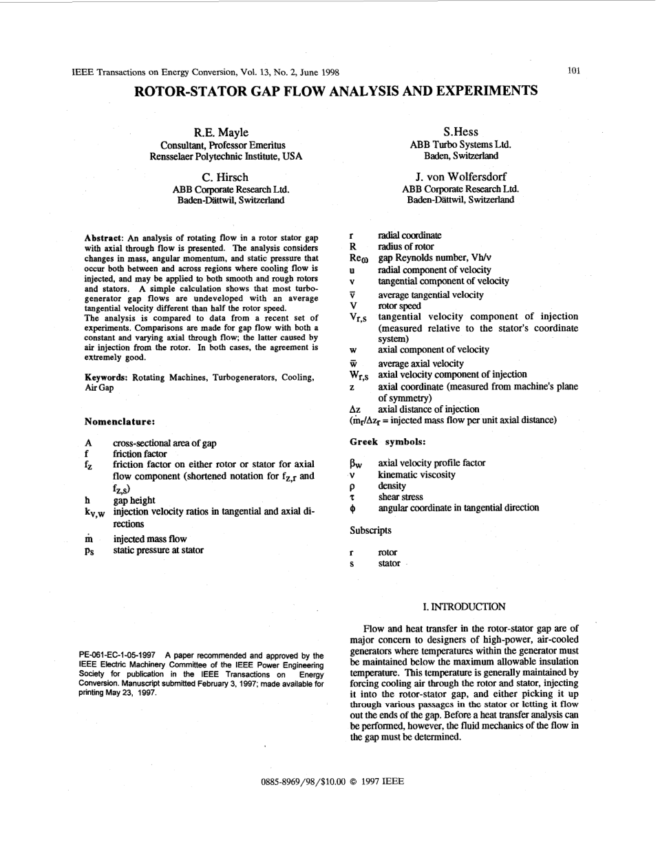 摘要:分析了带有轴向通流的转子-定子间隙内的旋转流动。分析认为,在冷却流注入的地区之间或跨越这些区域,质量,角动量,和静态压力的变化同时发生,并且可应用于光滑和粗糙的转子和定子。一个简单的计算表明,大多数涡轮发电机间隙流是不发达的,平均切向速度不同于转子转速的一半。