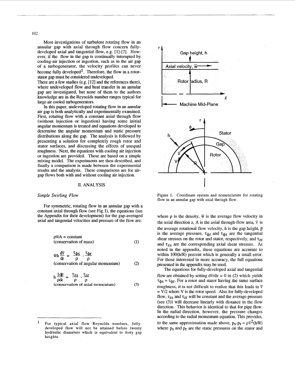 本文对环形气隙中未开发的旋转流动进行了分析和实验研究。首先,对具有一定的初始角动量的恒定轴向流过(没有注入或吸入)的旋转流动进行处理,并开发方程来确定沿间隙的角动量和静压分布。分析结果给出了完全粗糙的转子和定子表面的解决方案,并讨论了不均匀粗糙度的影响。接下来,提供冷却空气喷射或吸入的方程。这些都是基于一个简单的混合模型。最后对实验结果进行了描述,并将实验结果与分析结果进行了比较。这些比较适用于有气隙和不带冷气喷射的气隙流动。