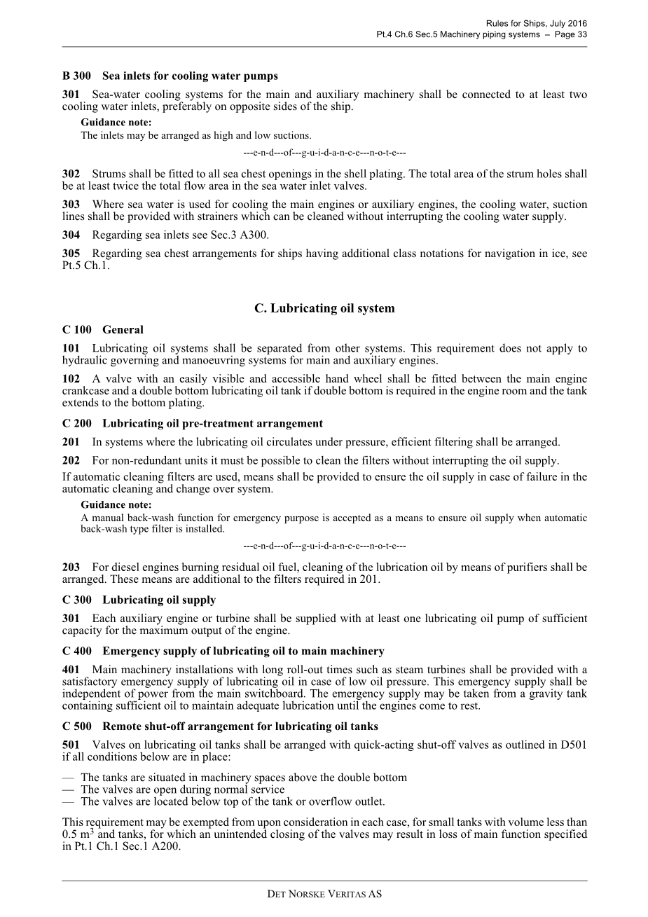 A 100 Redundancy and capacity 101 For definition of redundancy, see Ch.1. 102 Redundancy shall be arranged as specified in Ch.1, and capacity of redundant components shall be as specified in the requirements for the different systems. Applied to piping systems this implies that more than one pump unit shall be installed when failure of such a unit will result in loss of a main function specified in Pt.1 Ch.1 Sec.1 A200. The capacity is normally to cover demands at maximum continuous load on the component served when any pump unit is out of service. 103 Redundancy type R2 according to Ch.1 shall be established, i.e. the time lag involved in restoring the lost function shall not be more than 15 minutes. 104 For propulsion plants with one engine with output less than 400 kW and with pumps driven directly by the unit it serves, redundancy type 3 will be accepted. I.e. an easily removable pump of each type may be approved as a standby pump. A 200 Drip trays 201 All oil tanks in machinery spaces over double bottom tanks shall be equipped with drip trays of sufficient capacity and height for collecting any leakage of oil that may occur from valves, fittings etc. Drip trays shall be fitted under those parts of the oil systems which are often opened up for cleaning such as burners, purifiers,filters, etc. 202 Precautions shall be taken against overflow of oil from the lowest situated drip trays. Drainpipes led to double bottom tanks shall be provided with means for prevention of backflow. 203 The drip trays shall be drained to a closed waste tank not forming part of an overflow system. A 300 Oil filters 301 Duplex filters used in systems for flammable liquids shall be arranged with means for preventing opening of a filter under pressure. B. Cooling systems B 100 General 101 Centrifugal sea-water cooling pumps shall be installed as low as possible in the ship or other means shall be provided to prevent, as far as practicable, that the pumps lose water in a seaway. 102 For systems using fuel oil as a cooling agent, requirements in D are also applicable. B 200 Cooling water supply 201 For propulsion systems with an output of 400 kW or less, engine-driven bilge pumps can be used as standby cooling water pumps. 202 For auxiliary engines with engine-driven sea water cooling pumps a complete spare pump ready for mounting shall be delivered with the ship. If at least 3 auxiliary engines are installed, each with sufficient output for normal operation at sea, the requirement regarding a spare pump is waived. 203 For steam-driven propulsion plants the cooling water pumps for the main condenser shall be arranged with built in redundancy, to at least 30% capacity. 204 For condenser installations with scoop cooling, a standby cooling water pump with at least 30% capacity shall be installed. In addition the largest of the remaining sea water pumps in the machinery shall be arranged for emergency supply of cooling water to the main condenser. 205 If cooling water is used for heating of oil, the system shall be arranged to avoid contamination of the cooling water. For this purpose the heating coils shall be located on the pressure side of the cooling pumps. Alternatively a primary and secondary system arrangement may be used. In the case of direct heating the heating coils shall be all welded with no detachable connections where mixing of oil and water may occur. B 300 Sea inlets for cooling water pumps 301 Sea-water cooling systems for the main and auxiliary machinery shall be connected to at least two cooling water inlets, preferably on opposite sides of the ship. Guidance note: The inlets may be arranged as high and low suctions 302 Strums shall be fitted to all sea chest openings in the shell plating. The total area of the strum holes shall be at least twice the total flow area in the sea water inlet valves. 303 Where sea water is used for cooling the main engines or auxiliary engines, the cooling water, suction lines shall be provided with strainers which can be cleaned without interrupting the cooling water supply. 304 Regarding sea inlets see Sec.3 A300. 305 Regarding sea chest arrangements for ships having additional class notations for navigation in ice, see Pt.5 Ch.1. C. Lubricating oil system C 100 General 101 Lubricating oil systems shall be separated from other systems. This requirement does not apply to hydraulic governing and manoeuvring systems for main and auxiliary engines. 102 A valve with an easily visible and accessible hand wheel shall be fitted between the main engine crankcase and a double bottom lubricating oil tank if double bottom is required in the engine room and the tank extends to the bottom plating. C 200 Lubricating oil pre-treatment arrangement 201 In systems where the lubricating oil circulates under pressure, efficient filtering shall be arranged. 202 For non-redundant units it must be possible to clean the filters without interrupting the oil supply. If automatic cleaning filters are used, means shall be provided to ensure the oil supply in case 全文共56840字,剩余内容已隐藏,支付完成后下载完整资料 资料编号:[13276],资料为PDF文档或Word文档,PDF文档可免费转换为Word |
