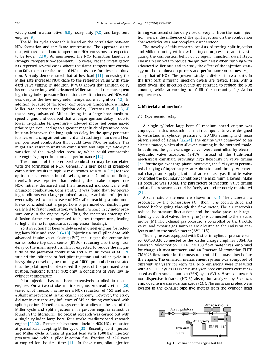 在船用发动机中尚未广泛研究引燃注入。在一个二冲程船用发动机上,Andreadis等人[20]试验了中试注入,实现了15%的氮氧化物减排量,并在发动机经济性方面略有改善。然而,该研究并未调查米勒计时与分流注射相结合的影响。尽管如此,有关在大口径发动机中使用米勒循环和分流喷射的系统研究在文献中找不到。目前的研究是在单缸大口径四冲程中速研究机上进行的[21,22]。以前的成果包括在部分负荷下40%的NOx减排,采用米勒循环[23]。最近,第一次试图在1500巴的喷射压力和25%的先导喷射燃料分数的情况下在部分负荷下进行分流喷射和米勒循环[11]。在这些运行中,先导喷射正时与主喷射非常接近或非常远。因此,分流喷射对燃烧特性的影响尚未完全了解。这项研究的新颖之处包括测试分流式喷油器和米勒,以低燃油喷射压力运行,并对喷油器进行研究燃烧行为在常规注射停留步骤。 主要目的是减少以高米勒速度运行时的点火延迟,并研究喷射策略对燃烧过程和性能结果的影响,特别是NOx的影响。本研究分为两部分。在第一部分中,测试了不同的注入时间。然后,通过固定停留时间,喷射事件被减缓以减少NOx量,同时试图满足即将出台的法规要求。