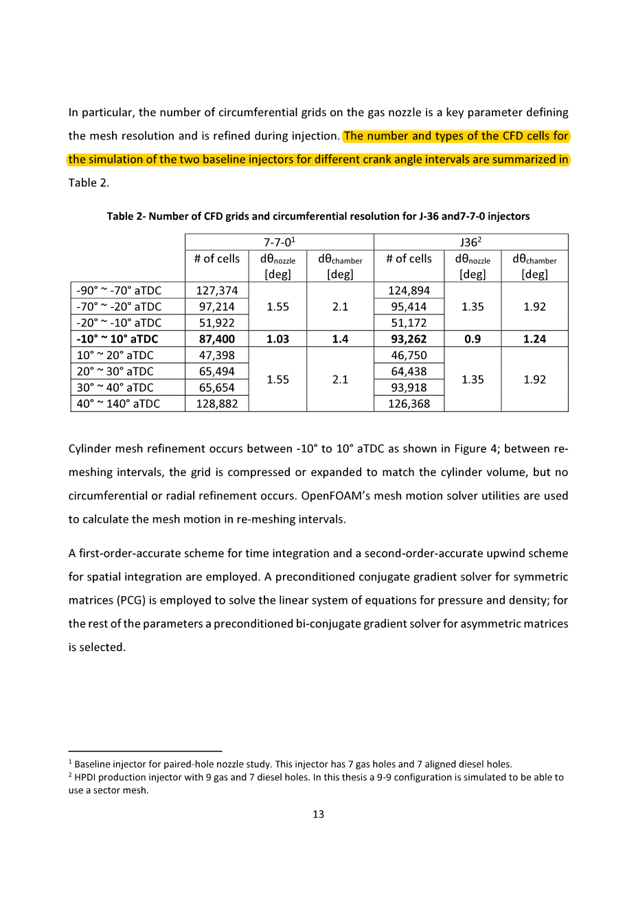 为了避免过多的计算成本,GOLD模拟了燃烧室的一个扇形区域,包括一个气体喷嘴和一个柴油喷嘴。因此,周期(循环)的边界条件就被选来用于扇形区域的分割(左边界和右边界)。此外,并不是模拟一整个4冲程发动机循环,即720度曲轴转角,而只是仅仅模拟从上止点后-90°一直到140°时排气口打开的这部分循环的封闭部分。因此,可以避免在进排气口和进排气阀周围模拟进气和排气流量的额外负担。同时,相对于720°的一个完整循环,持续模拟过程减少到了仅仅230°,即减少了70%。为了进一步提高效率,在上止点附近进行重新网格化,从而避免了极端单元纵横比,得到了在气体注入过程中高分辨度的CFD网格。在整个循环过程中,燃烧室不同区域之间的网格尺寸比例保持不变。特别是,气体喷嘴上周向网格的数量是定义网格分辨率的一个关键性参数,它也将在进气过程中被细化。在表2中,总结了在不同曲轴转角间距下两种基线喷射器模拟的CFD单元数量和类型。
