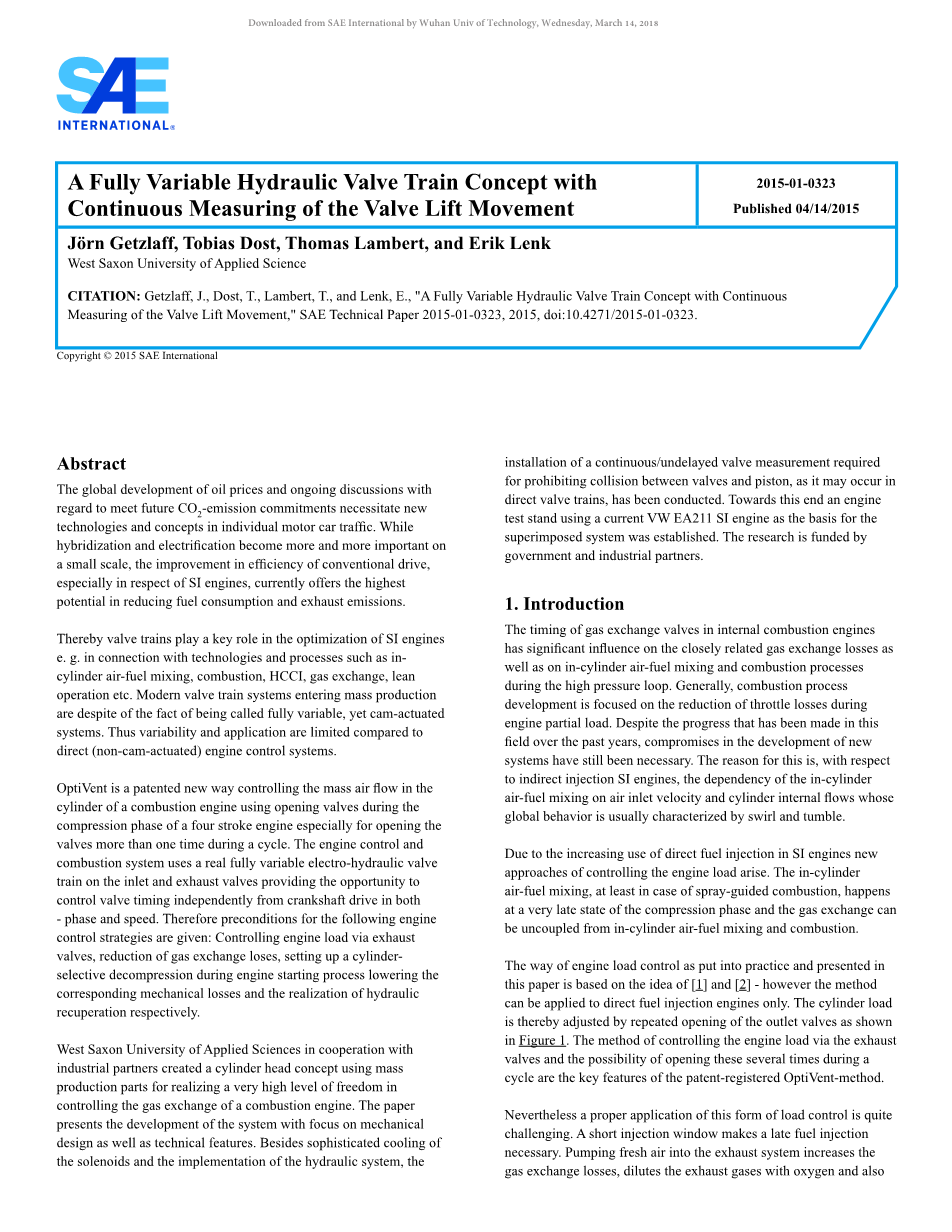 西萨克森应用科学大学与工业伙伴合作,创建了一个使用批量生产部件的气缸盖概念,以实现极高的控制自由度内燃机的气体交换。本文介绍了该系统的开发过程,重点介绍了机械设计和技术特点。除了精密的螺线管冷却和液压系统的实施,还安装了连续/无延迟的气门测量,以防止气门和活塞之间的碰撞。为此,建立了一个以目前大众EA211SI发动机为基础的发动机试验台。这项研究由政府资助。
