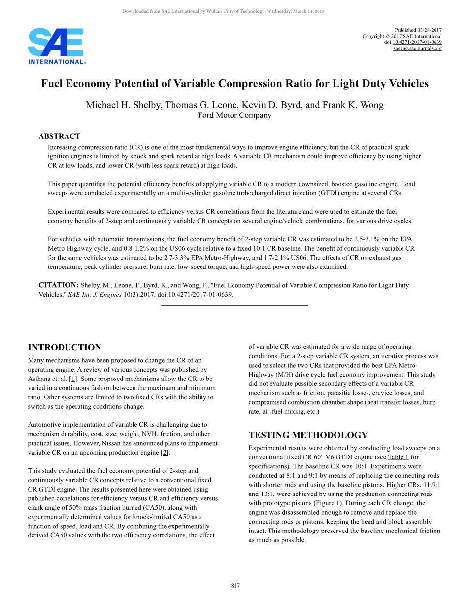 提高压缩比(CR)是提高发动机效率的最基本方法之一,但实际上火花点火发动机的压缩比在高负荷下受到爆震和点火延迟的限制。可变压缩比机构可以通过在低负荷下使用更高的压缩比来提高效率,并且在高负荷下使用更低的压缩比(具有更少的点火延迟)。量化了将可变压缩比技术应用于现代小型增压汽油发动机的潜在效益。本次试验在多缸汽油涡轮增压直喷(GTDI)发动机上以几个不同的压缩比进行。将实验结果与文献中的效率与压缩比的相关性进行比较,并用于评估在多种发动机/车辆组合中的燃油经济性效益。对于具有自动变速器的车辆,EPA地铁-公路循环中两级可变压缩比的燃油经济性效益估计为2.5-3.1%,而US06循环相对于固定的10:1 的最低压缩比,效益为0.8-1.2 %。预计相同车辆采用连续可变压缩比的效益在EPA地铁-公路循环为2.7-3.3%,在US06循环为1.7-2.1%。同时还研究了压缩比对排气温度、峰值气缸压力、燃烧速率、低速扭矩和高速动力的影响。