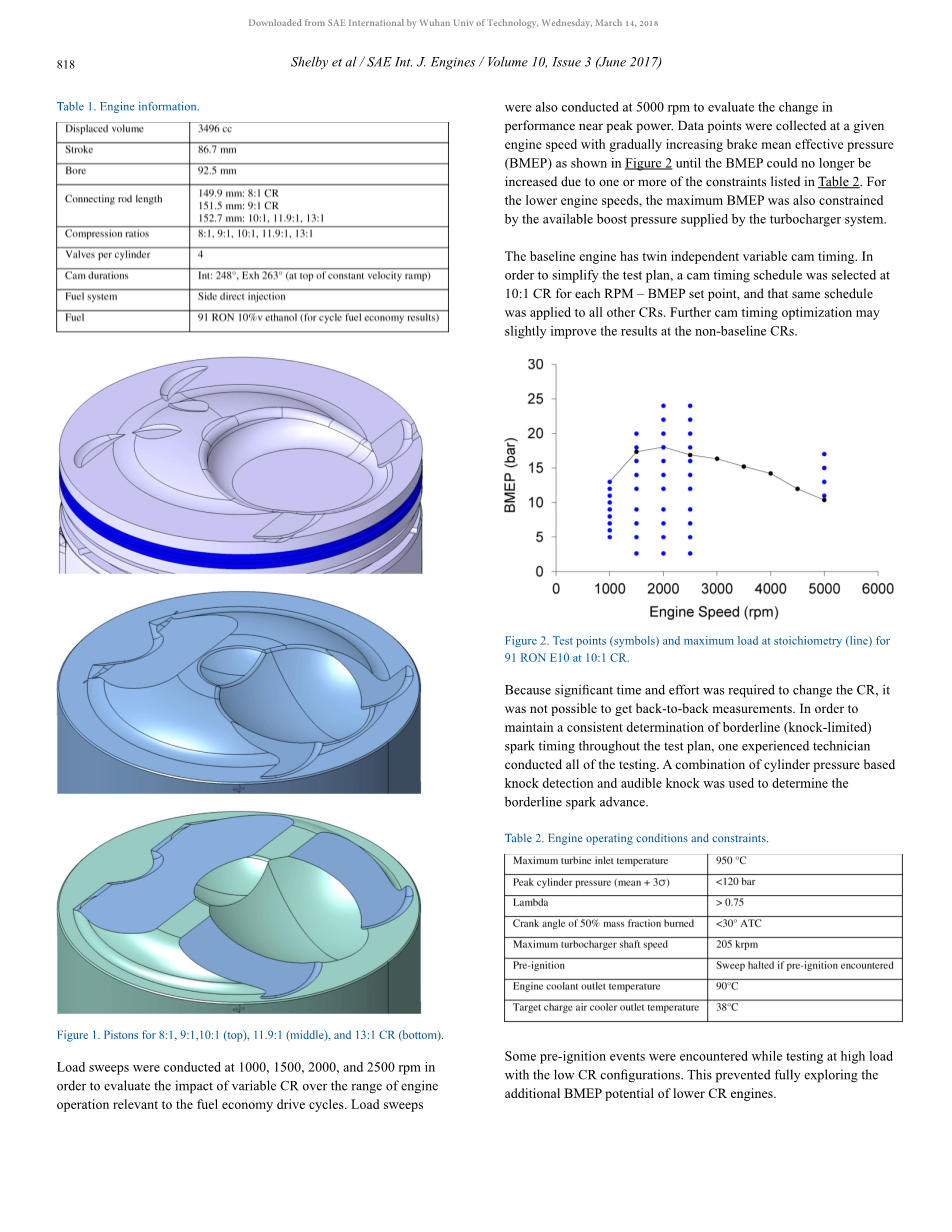 通过在传统的固定压缩比60°V6 GTDI发动机上进行负荷扫描,获得了实验结果(发动机规格参见表1)。基础压缩比为10:1。通过用较短的杆替换连杆并使用基准活塞以8:1和9:1的压缩比进行实验。通过使用生产的连杆搭配原型活塞实现更高的压缩比(11.9:1和13:1)(图1)。在每次改变压缩比时,发动机需要进行足够的改变以拆除和更换连杆或活塞,从而保持头部和缸体组件完好无损。这种方法尽可能地保留了基线机械摩擦。