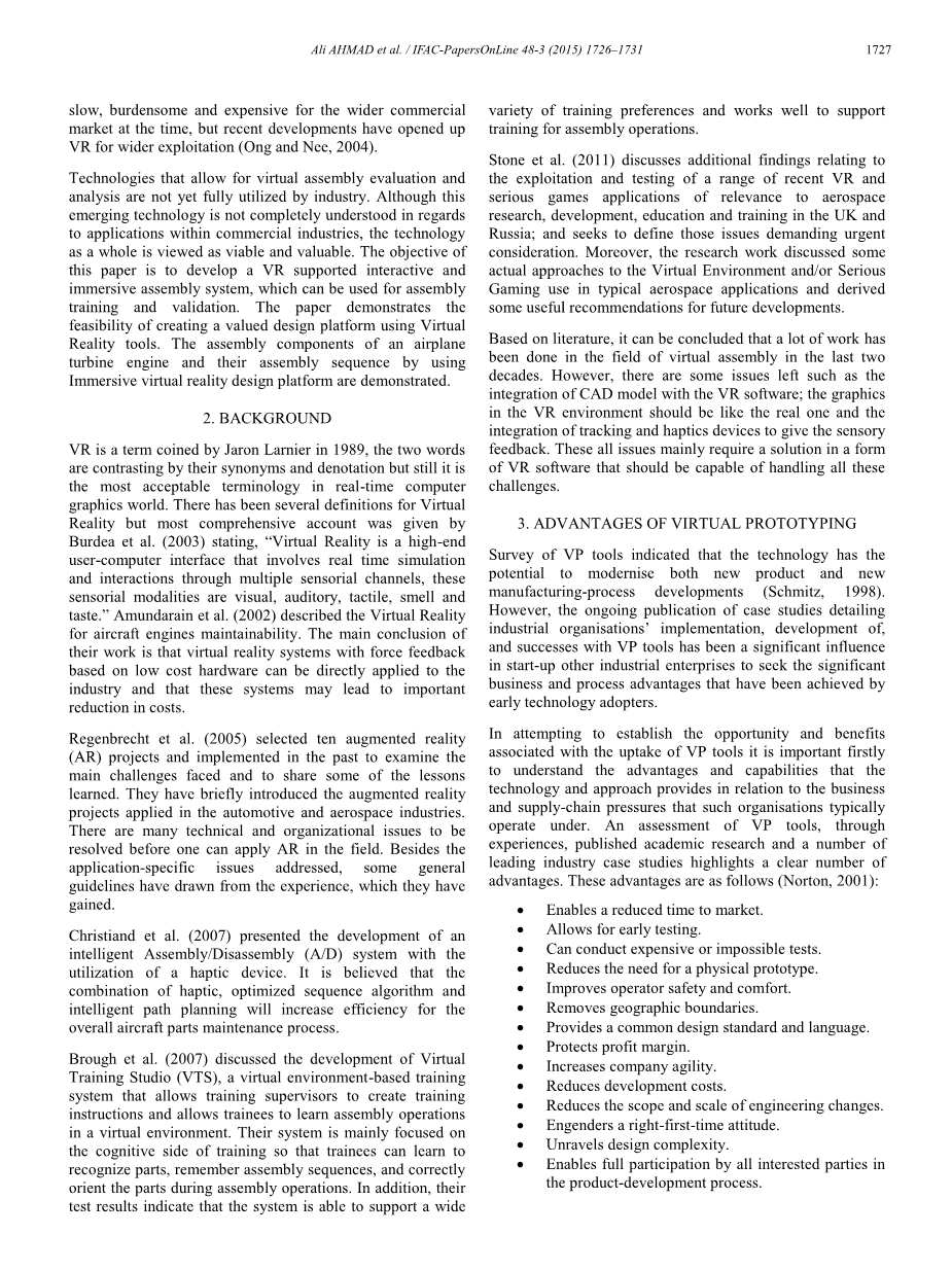 虚拟现实(VR)是Jaron Larnier在1989年创造的一个术语,这两个词实际上是互相对立的,但它仍然是实时计算机图形世界中最好接受的术语。对于虚拟现实有多种定义,但Burdea等人给出了最全面的解释,“虚拟现实是一种高级的用户-计算机接口,它包括实时模拟和通过多个感知通道进行交互,这些感觉模式是视觉、听觉、触觉、嗅觉和味觉。”Amundarain等人(2002)描述了飞机引擎维护的虚拟现实模拟方法。他们工作的主要结论是,基于低成本硬件的力反馈的虚拟现实系统可以直接应用于该行业,这种系统可能会大幅降低原来的成本。