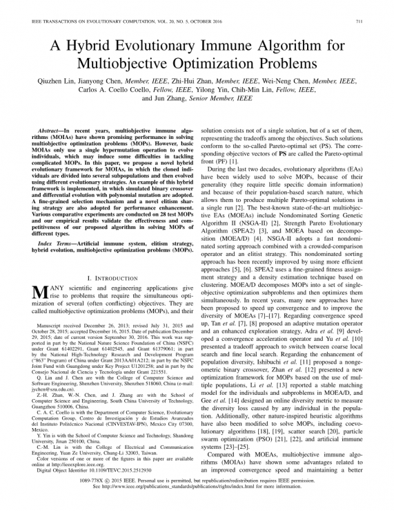 以上部分介绍了HEIA的主要组成部分,即克隆,进化策略,精英库和选择。其他实现细节在HEIA的伪代码中描述,如算法3所示,g和max_g分别表示当前代数和最大代数,是往返于[0,1]中的均匀分布随机数。在算法1中描述的初始化之后,HEIA进入进化过程的循环,直到最大代数即max_g。首先,根据抗体之间的亲缘关系对其进行分类,从精英库E中挑选出具有高亲和力的抗体E。然后,每个选择的抗体是通过克隆的复制品复制的,每个克隆体被随机分配到两个亚种群中的7-13行。在那之后,两个亚种群分别用进化1和进化2进行置换,如III-B1和III-B2节所述。最后,突变的亚种群和原始库E用作运行算法2的输入,这将会保持个在E中的非支配解。上述进化阶段将重复进行,直到(预定义的)最大代数max_g为止。在算法的最后,E中的非支配解被设定为我们最后的。