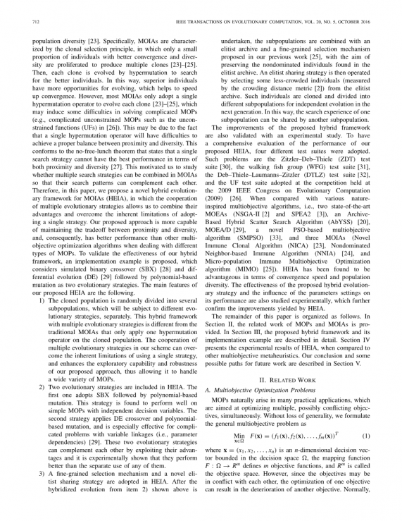 在我们提出的框架中,克隆被随机分为多个亚种群,服从均匀随机分布。然后,通过使用多种进化策略分别进化多个亚种群。在混合框架中使用多种进化策略降低了使用单一策略的风险,这对于特定问题可能是不适当的或无效的。这种现象在第IV-F节描述的实验研究中得到验证。这种混合策略提高了HEIA的全局搜索能力以及在解决不同类型的复杂MOP时的鲁棒性。这里,两组进化算子用于说明混合框架的行为。