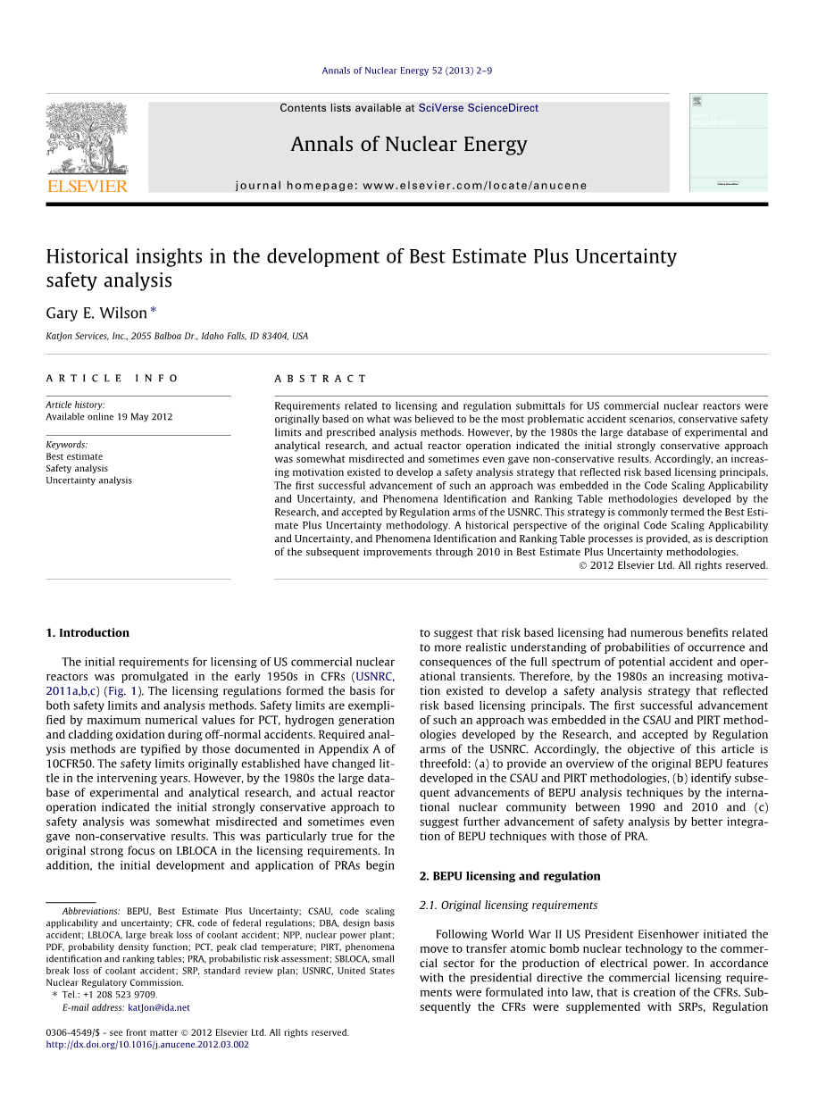 本文的三个目的如下:(a)提出一个由CSAU和PIRT方法开发出的原始的BEPU(最佳估算和不确定性方法)的特性;(b)在1990年到2010年间通过国际核委员会确定BEPU分析技术的改进方法;(c)通过PRA与BEPU技术更好的结合提出对安全分析进一步的改进。