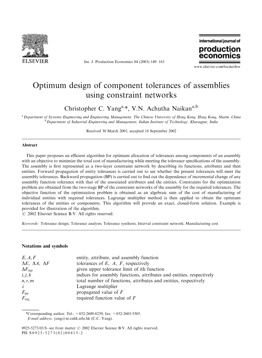 本文提出了一种有效的算法,用于在组件的各个部件之间实现公差的最佳分配,以便在满足组件公差规格的同时最小化制造总成本。该程序集首先通过描述其功能,属性和实体来表示为双层约束网络。执行实体公差的前向传播以查看当前公差是否满足装配公差。执行向后传播(BP)以找出任何装配功能容差的增量变化与相关属性和实体的增量变化的依赖关系。优化问题的约束条件是从装配的约束网络的两阶段BP获得所需的公差。优化问题的目标函数是作为具有所需公差的单个实体的制造成本的代数总和而获得的。然后应用拉格朗日乘子法来获得实体或部件的最佳容差。这个算法将提供一个精确的封闭形式的解决方案。提供示例用于说明该算法。
