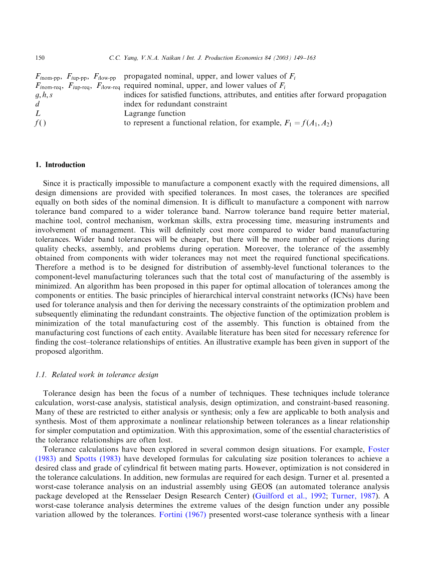 公差计算已经在几种常见设计情况下进行了探索。例如,Foster(1983年)和Spotts(1983年)已经开发了用于计算尺寸位置公差的公式,以实现配合部件之间圆柱形配合的分类和等级要求。但是,在公差计算中不考虑优化。另外,每个设计都需要新的公式。Turner等人利用GEOS(在Rensselaer设计研究中心开发的自动化公差分析软件包)(Guilford等人,1992年; Turner,1987年)对工业装配进行了最坏情况下的公差分析。最坏情况下的公差分析决定了公差允许的任何可能变化下设计函数的极限值。 Fortini(1967年)提出了一个线性设计方程的最坏情况公差综合,方程中假定设计变量和公差变量的极限,用于获得剩余公差变量的总体极限。