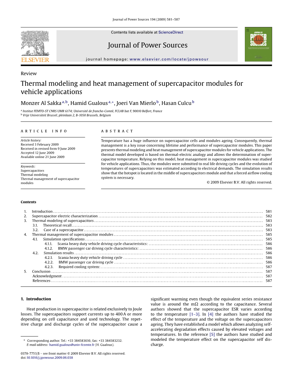 温度对超级电容器电池和模块老化有巨大的影响。因此,热管理是超级电容器模块寿命和性能的关键问题。本文介绍了用于车辆应用的超级电容器模块的热建模和热管理。所开发的热点模型基于热电类比,并且允许确定超级电容器的温度。依靠这种模型,超级电容器模块的热管理被研究出来以用于车辆应用。因此,模型被提交到现实生活中的驾驶循环,并且根据电力需求估计超级电容器的温度演变。仿真结果表明,热点位于超级电容器模块的中间以及需要强制气流冷却系统。