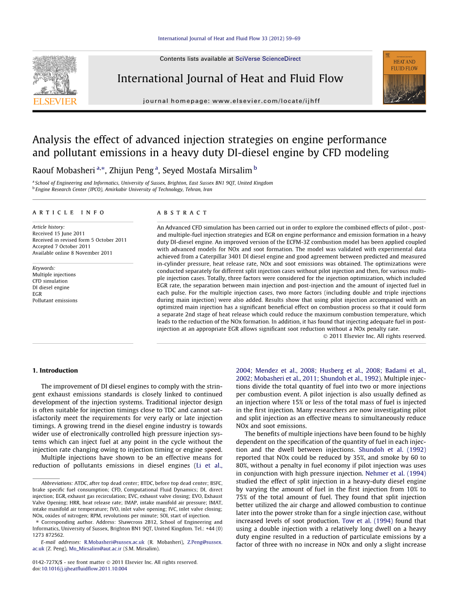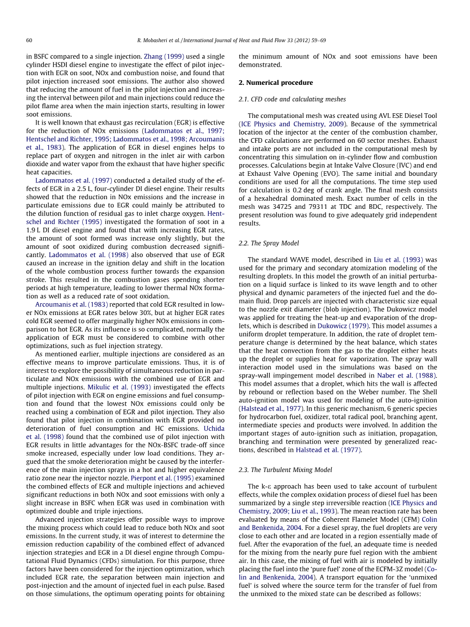 已经发现多次喷射的好处高度依赖于每次喷射中燃料量的规格以及喷射之间的停留时间。Shundoh等人(1992)报道,如果先导喷射与高压喷射结合使用,则NOx可以减少35%,并且吸烟60-80%,而不损害燃料经济性。Nehmer等人(1994)通过将第一次喷射中的燃料量从总燃料量的10%改变到75%,研究了重型柴油机中的分流喷射的效果。他们发现分流式喷射更好地利用了空气充量,并且允许燃烧继续进入动力冲程,而不是单个喷射情况,而不增加烟灰产生量。Tow等人(1994)发现,在重型发动机上使用双重喷射并保持相对较长的停留时间,导致颗粒物排放减少三分之一,NOx没有增加,而BSFC与单次喷射相比只有轻微增加。Zhang(1999)使用单缸HSDI柴油发动机来研究先导喷射EGR对烟尘,NOx和燃烧噪声的影响,并发现喷射引发增加了烟尘排放。作者还表明,在主喷射开始时减少试点喷油中的燃油量并增加喷油和主喷射之间的间隔可以减少试点火焰面积,从而降低烟尘排放。