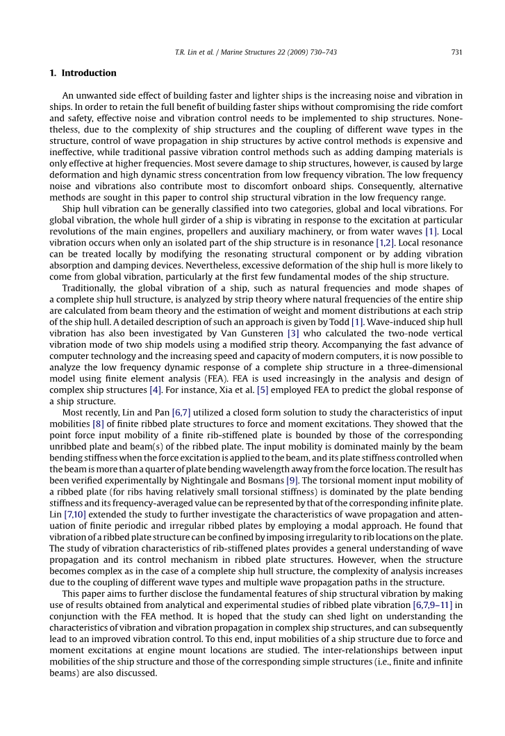 最近,Lin和Pan[6,7]利用封闭形式解决方案来研究输入的特征有限的肋板结构的流动性[8]以施加力矩和激励。他们表明,有限肋加筋板的单点力输入流动受相应的约束未加肋板和肋板的梁。输入移动性主要由光束支配当对梁施加力激励时的弯曲刚度,以及当其受到板刚度控制时梁远离力位置的板弯曲波长的四分之一以上。结果是已经通过Nightingale和Bosmans的实验验证[9]。扭矩输入的流动性肋板(对于具有较小扭转刚度的肋板)受板弯曲的支配刚度及其频率平均值可以用相应的无限板的刚度和频率平均值表示。Lin[7,10]扩展了该研究以进一步研究波传播和衰减的特性有限周期和不规则肋板通过采用模态方法。他发现可以通过对板上的肋条位置施加不规则性来限制肋板结构的振动。对肋加劲板的振动特性的研究提供了对波浪的一般理解传播及其在肋板结构中的控制机制。但是,当结构如同完整的船体结构那样变得复杂,分析的复杂性增加由于结构中不同波型和多波传播路径的耦合。