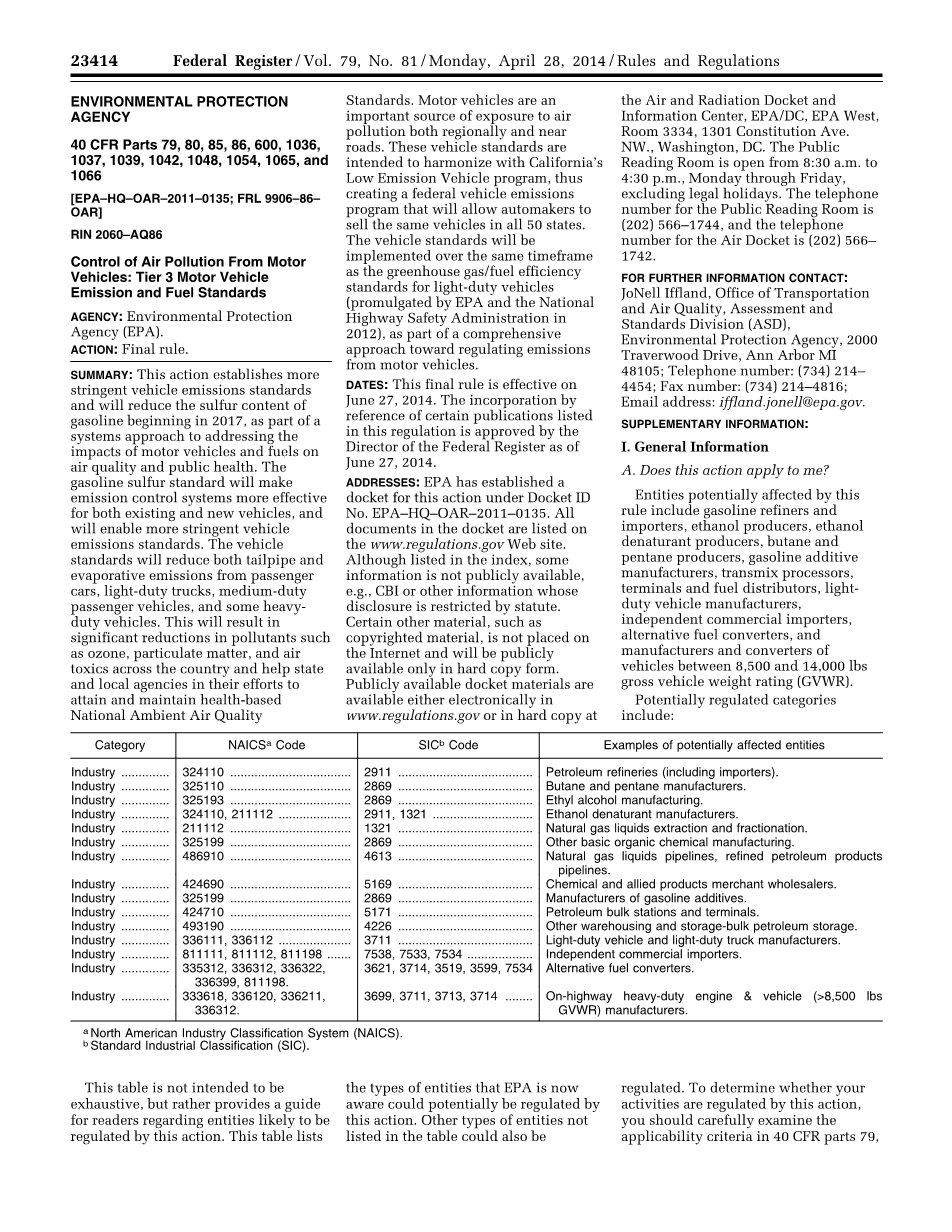 本表只是粗略可能受影响的实体及其潜在监管的类别,而是为读者提供一些指导,让读者了解可能被本方案所影响的实体。本表列出了EPA现在意识到本方案可能影响的实体,也可能监管表中未列出的其他类型的实体。要确定你的活动是否受本方案影响,你应该仔细检查40CFR第79、80、85、86、600、1036、1065与1066部分与所参考规范中的适用性标准。如果对于本方案适用性对于具体实体有任何问题,请咨询前面详细资料联系部门中给出的联系人。
