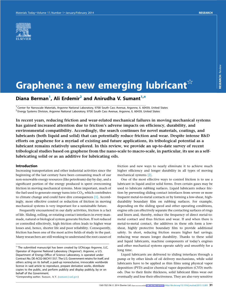 石墨烯是二维材料,具有独特的摩擦磨损性能,在传统材料中并不常见。除了具有良好的热学、电学、光学和力学性能外,石墨烯还可作为固体或胶体液体润滑剂。其高化学惰性,极端强度和易剪切能力在其密集包装和原子平滑的表面是主要的有利属性令人印象深刻的摩擦学行为。因为它甚至薄于多层膜,可应用于纳米尺度或微尺度系统,如微机电系统(MEMS)和系统(NEMS)摆动、旋转、滑动接触减少静摩擦,摩擦,磨损。