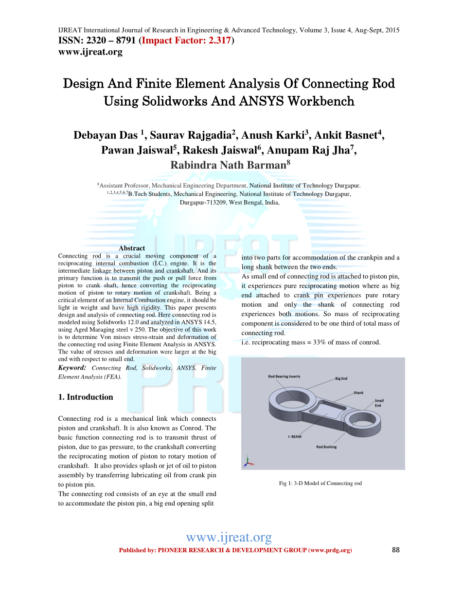 问题的目的是使用SolidWorks 12完成v250级马氏体时效钢连杆的设计,并进行了有限元分析(FEA)在ANSYS 14.5制备的模型,并确定冯氏等效应力和应变值。