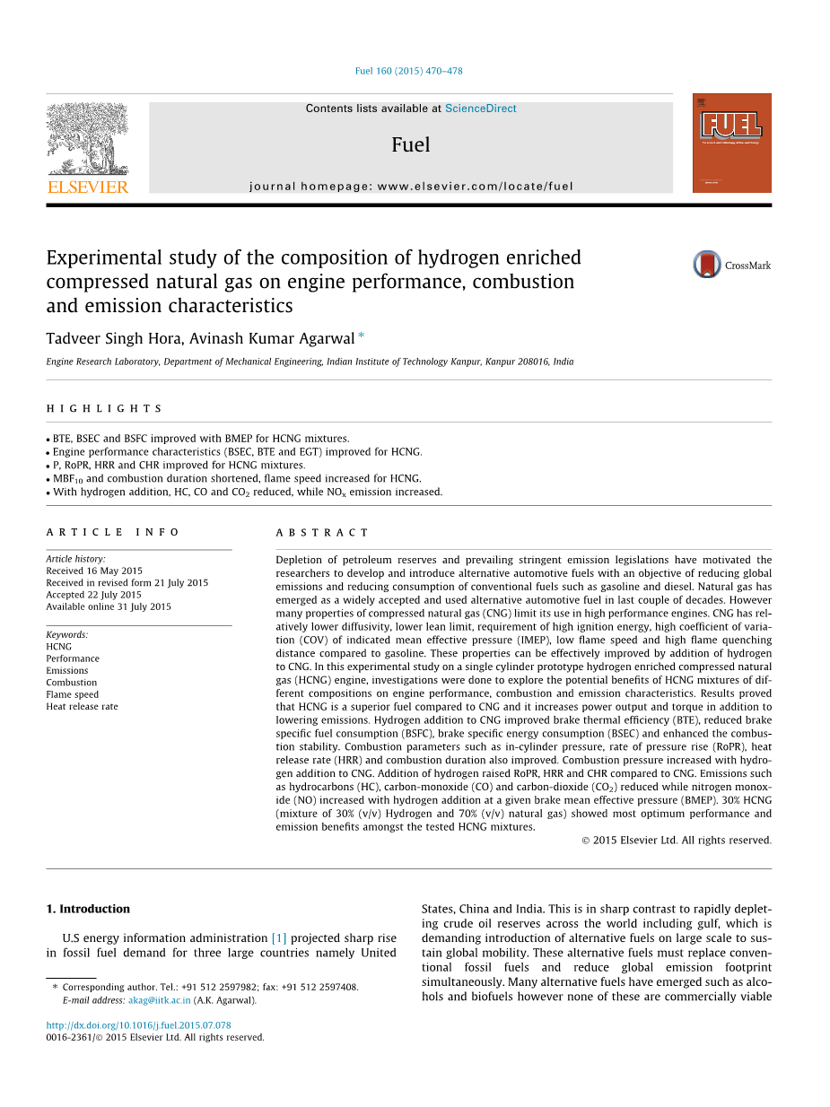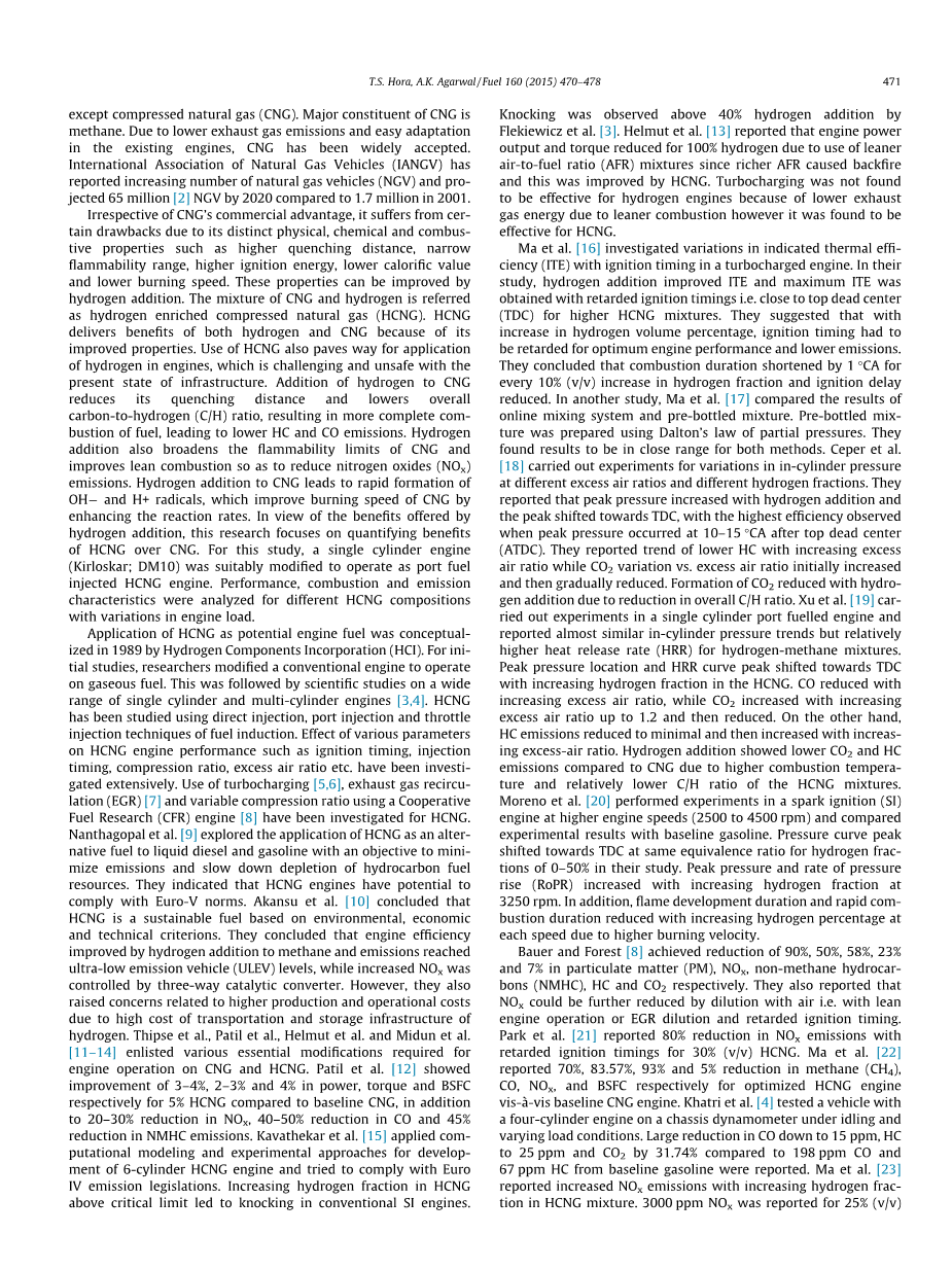 无论CNG的商业优势如何,由于其独特的物理、化学和燃烧性质如较高的淬火距离,较窄的可燃性范围,较高的点火能量,较低的热值和较低的燃烧速度而具有某些缺点。这些性能可以通过添加氢来改善。CNG和氢的混合物被称为掺氢压缩天然气(HCNG)。由于其性能得到改善,HCNG可以提供氢气和CNG的优势。 HCNG的使用也为氢气在发动机中的应用铺平了道路,这对目前的基础设施而言具有挑战性,也不安全。在CNG中添加氢气可减少其淬火距离并降低总的碳/氢比(C / H),从而使燃料更加完全燃烧,降低HC和CO排放。掺氢还扩大了CNG的燃烧极限,并改善了稀燃,从而减少氮氧化物(NOx)排放。氢气加入到CNG导致OH-和H 自由基的快速形成,通过提高反应速率来提高CNG的燃烧速度。考虑到掺氢有这么多好处,这项研究侧重于量化HCNG对CNG的改善。在这项研究中,一台单缸发动机(Kirloskar; DM10)经过适当的修改,可以用作进气管燃料喷射式HCNG发动机。本文针对随负荷不同而变化HCNG组成,分析发动机性能,燃烧和排放特征。
