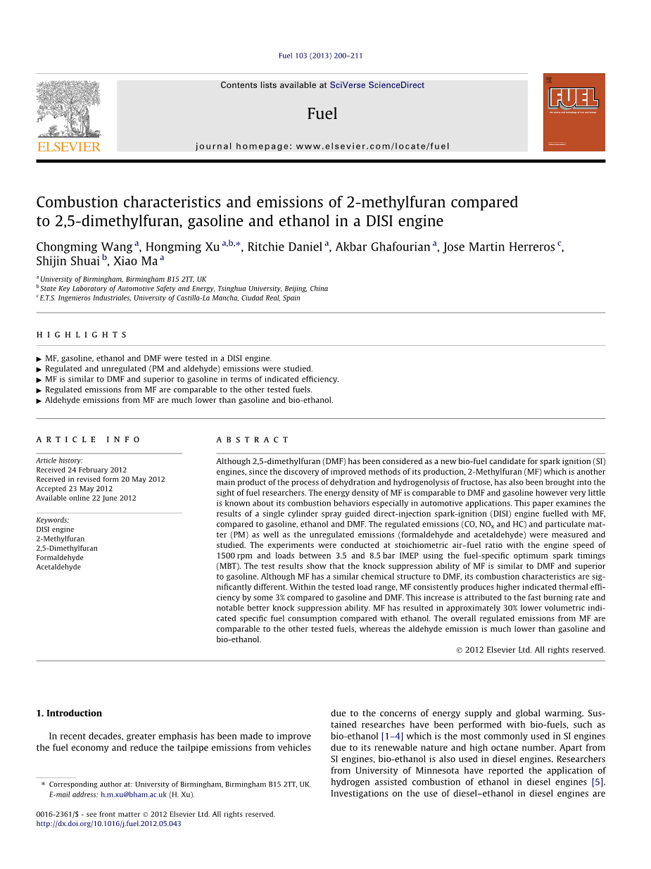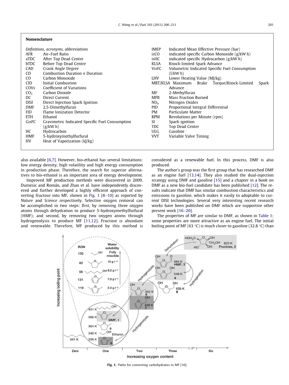 MF改进的生产方法在2009年被发现:Dumesic 、Romaacute;n,和Zhao等人独立发现并进一步开发了一种高效的由果糖转化为MF的方法,并分别在自然和科学板块发表。选择性除氧可以分为两个步骤: 第一是通过脱水去除三氧原子产生5-羟甲基糠醛(HMF); 第二是通过氢解去除两个氧原子来生产MF。果糖是丰富的可再生物,因此,该方法生产的MF也被认为是一种可再生燃料。在这个过程中,DMF也产生了。该论文笔者的研究小组是第一个研究 DMF 为发动机燃料的小组。他们还研究了采用DMF和汽油的双重喷射策略, 并出版了一本关于DMF作为新的生物燃料候选者的书。研究结果表明,DMF和汽油具有相似的燃烧排放特性, 使它更容易适应当前的缸内直喷技术。最近发表的一些对于DMF非常有趣的研究结果也很支持现有的研究工作。