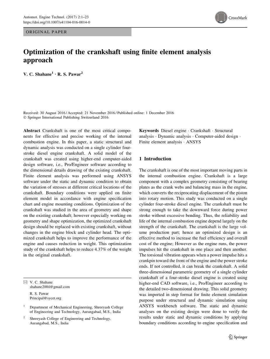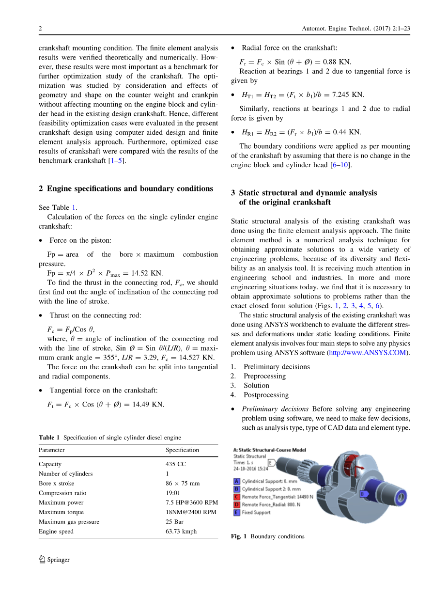 曲轴是内燃机中最重要的运动部件之一。曲轴是一个具有复杂几何形状的大型部件,由曲轴腹板和发动机中的平衡重组成的支承板构成,可将活塞的往复位移转换为旋转运动。这项研究是在单缸四冲程柴油发动机上进行的。曲轴必须有足够的强度,以便在动力冲程期间承受向下的力而不会过度弯曲。因此,内燃机的可靠性和寿命在很大程度上取决于曲轴的强度。曲轴是大批量生产部件,因此优化设计是提高发动机燃油效率和整体成本的有效方法。然而,随着发动机的运转,动力冲击在一个地方和另一个地方撞击曲轴。当动力冲击撞击发动机前部的曲轴销并且动力冲程结束时,会出现扭转振动。如果不加以控制,可能会损坏曲轴。根据详细的二维图,使用高级CAD软件,即Pro / Engineer,建立四冲程柴油发动机的单缸曲轴的三维参数几何实体。使用ANSYS Workbench软件进行结构和动态仿真时,这种立体几何图形以步骤格式导入,以进行有限元仿真。根据发动机规格和曲轴安装条件应用边界条件来验证静态和动态条件,从而得到对现有设计进行的静态和动态分析,有限元分析结果在理论和数值上都得以验证。然而,这些结果作为曲轴进一步优化研究的基准是最重要的。通过研究几何形状和形状对配重及曲柄销的影响,对现有设计曲轴上的发动机缸体和气缸盖上的安装进行了优化。因此,本曲轴设计中使用计算机辅助设计和有限元分析方法对不同的可行性优化方案进行了评估。此外,还将曲轴的优化方案结果与基准曲轴[1-5]的结果进行了比较。