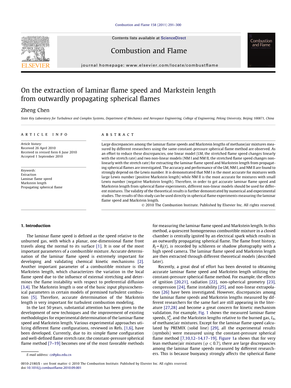 采用理论分析的方法来研究LM、NM I、和NM II有两条主要优点:(1)理论分析中可得到层流火焰速度和Markstein长度的精确值;这两个精确值可与提取值进行比较,从而能严格评估不同外推法的精度。(2)理论分析中可以得到被拉伸层流火焰速度和拉伸率的精确值;从而来自于浮力、着火、非球面几何、辐射、压缩的影响以及计算导数的误差都可以得到消除。