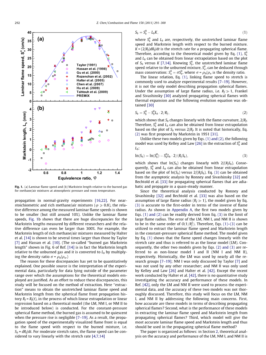 由于Ronney、Sivashinsky[32]和Bechtold et al.[33]进行的理论分析同样基于火焰大半径()的假设,等式(3)给出的模型在一阶下,相对火焰半径的倒数是准确的。如附录A所示,在火焰大半径的条件下,由等式(1)和等式(2)给出的前两个模型易由等式(3)推导出来。LM、NM I和NM II的误差被证明与同阶。因此,在定压球形火焰法中,等式(1)-(3)可以用来提取层流火焰速度和Markstein长度。等式(1)给出的模型显示火焰速度随拉伸率线性变化,因此被称作线性模型(LM)。同样地,等式(2)和等式(3)给出的另外两个模型分别被称为非线性模型I和非线性模型II(NM I和NM II)。从历史上看,几乎所有研究团队[7-19]都使用LM;NM I仅被Taylor[7]讨论过,没有被其他研究者使用过;NM II仅被Kelley、Law[26]和Halter et al.[42]使用过。除了最近由Halter et al.[42]主导的工作,目前没有关于这些模型精度和性能的定量研究开展。在参考文献[42]中,仅使用了LM和NM II来处理实验数据,并且也没有彻底讨论这两种模型的精度。因此,本课题主要通过讨论下列几个问题来研究LM、NM I和NM II。第一,这些模型在描述球形传播火焰时精度如何?第二,使用这些模型从球形传播火焰提取层流火焰速度和Markstein长度的性能如何?第三,哪个模型能给出最准确的层流火焰速度和Markstein长度,并应在球形传播火焰法中使用?
