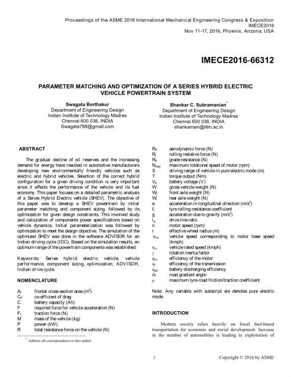 关键词:串联混合动力汽车,汽车性能,组件尺寸,优化,ADVISOR,印度的驾驶循环。